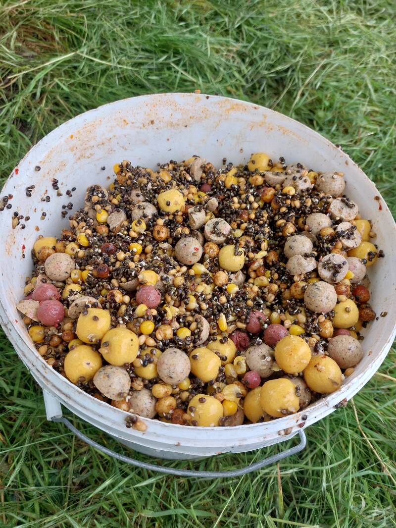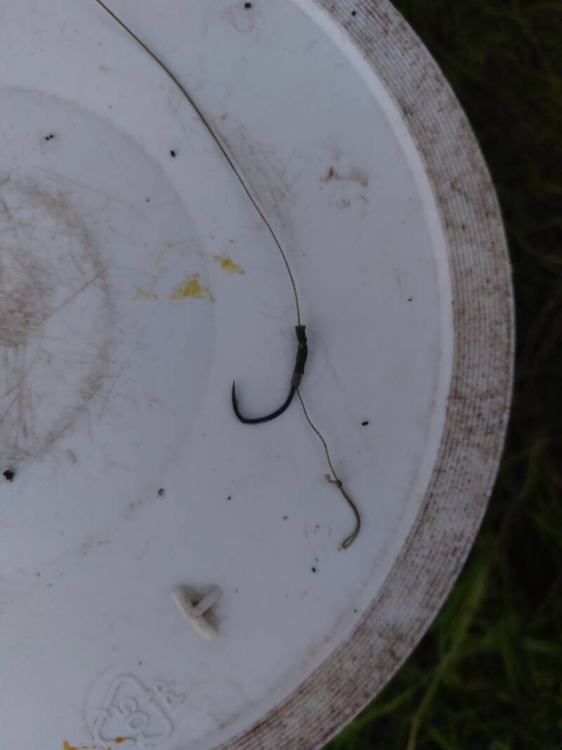 Opengebogen haak na een zware dril in het wier. Een emmertje voer uit het voorjaar.