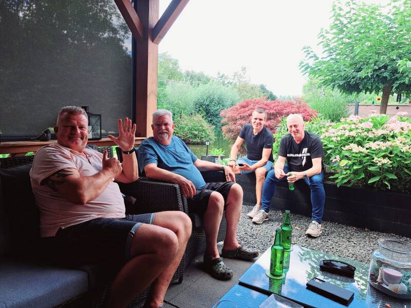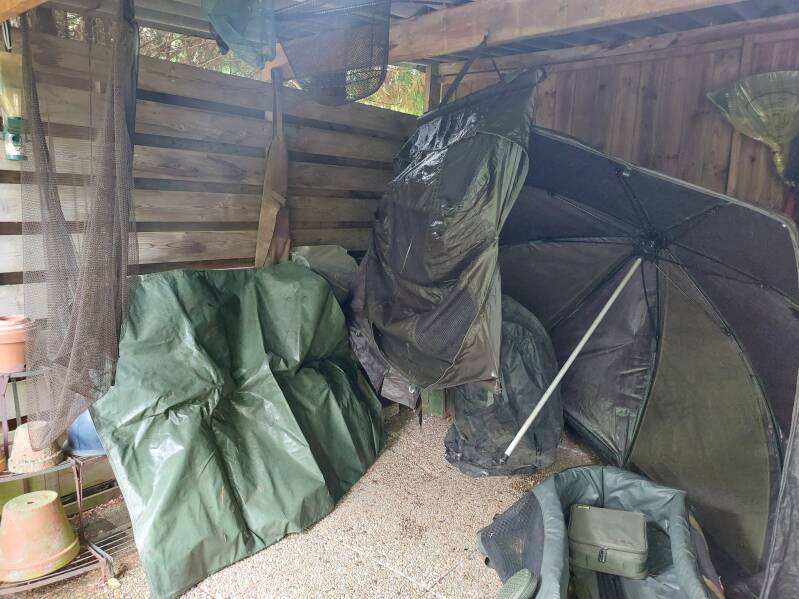 Als na een zeiknatte nacht alles thuis moet drogen. Team Carp Den Bosch tijdens een social bij Captain Mick. (Gaffer)