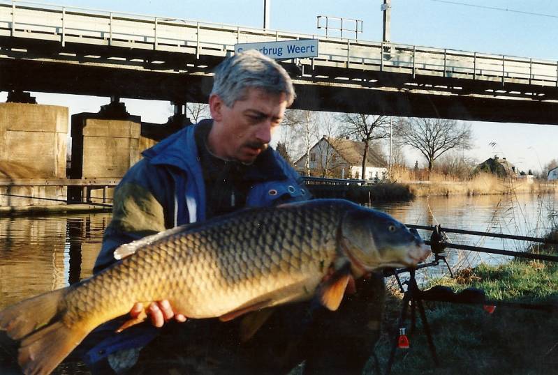 Op vrijdag 31 juli, na een volledige week wachtdienst, kom ik om 05.15 aan op mijn VW-stek. Hoe kan het ook anders? Met het vorige succes nog vers in het geheugen zal deze stek, in ieder geval tot aan mijn vakantie, mijn voorkeur genieten. Om half zes heb ik ingegooid. Het weer lijkt in geen enkel opzicht op de dag van mijn laatste succes. Het regent, de lucht is grauw, er staat een behoorlijke wind uit het zuidzuidwesten en het is gewoon fris aan het water. De hele ochtend manifesteren zich de nodige plukken op de top van mijn rechter hengel die onder de eigen kant ligt. Vorige keer was dat mijn linker stok maar omdat ik er toen niet helemaal gerust op was dat mijn tweede hengel niet in de weg zou liggen heb ik dat deze keer gewijzigd. Een tweede reden is dat het water hier over het algemeen van links naar rechts stroomt (ook door de werking van de sluis) en dat een vis die het geurspoor van mijn aas oppakt niet vlak voor mijn voeten langs hoeft te zwemmen om bij het aas te komen. Maar, terug naar de plukken op de top. Ik verwachtte eigenlijk voortdurend een aanbeet maar er gebeurde helemaal niets. Pas bij binnendraaien (zes uur later) zag ik waarom. De boilie was met de hair boven het lood om de hoofdlijn gedraaid, waardoor de haak ondersteboven tegen het lood aan hing. Gelukkig kreeg ik om vijf over elf op mijn andere hengel wel een run. Een van de mooiste gevechten uit mijn 'karper loopbaan' volgde. Niet zozeer omdat de vis aan de andere kant extreem groot of sterk was maar door de helderheid van het kanaalwater en het inmiddels doorgebroken waterige zonnetje. Deze laatste scheen precies met de juiste hoek in het water waardoor ik bijna de hele dril heb kunnen zien plaatsvinden. Ik zag dan ook direct dat mijn tiende twintiger zich had aangediend. Met zijn 86 centimeter iets groter dan mijn laatste dertiger maar door zijn bouw exact tien pond lichter zo zou later blijken. Na de vis te hebben gefotografeerd mag hij weer naar huis. Ik doe hetzelfde.