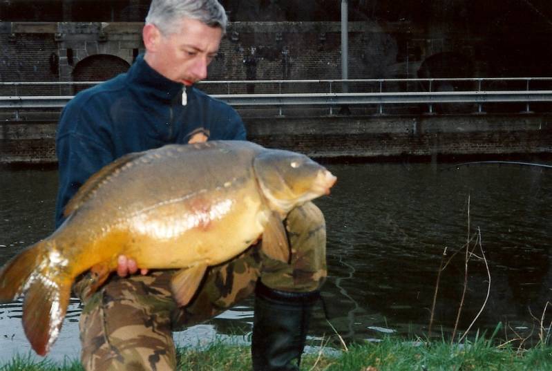 Als ik na enige tijd de vis voor het eerst te zien krijg aan de overzijde van het kanaal zie ik ook dat het in ieder geval een hoge twintiger betreft. Deze gedachte wordt nog versterkt als de vis vlak voor de kant begint met het draaien van zijn achtjes. Ik begin voorzichtig aan een dertiger te denken, niet vanwege zijn lengte maar voornamelijk vanwege zijn hoogte en breedte. Als ik na ongeveer 8 minuten de vis eindelijk in mijn landingsnet heb, met een zucht van verlichting, omdat toen ik wist wat ik aan de lijn had ik bang was voor een losschietende haak, weet ik zeker dat ik een dertig ponds schubkarper heb gevangen. De eerst op nul gestelde unster stelt mij in het gelijk. Zestien kilo en negenhonderd gram. Na aftrek van het net blijft er 32 pond en 1 ons over. Ik meen op basis van de verhalen van Serge en Johan de vis te herkennen als de Hongaar vanwege de hoge knik achter de kop en zijn relatief kleine staart. De staartwortel daarentegen is twee keer zo dik als mijn pols. Na het nemen van de foto's met de zelfontspanner waarvan ik hoop dat ze gelukt zijn en nog twee foto's door een vriendelijke voorbijganger mag de vis weer retour. Hij zwemt gelukkig vrij snel weer weg. Eigenlijk blijft dat het mooiste deel van de vangst. Een mooie vis die na een spannende dril rustig van je vandaan zwemt.