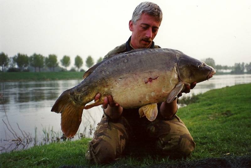 Heel eenvoudig zwemt de vis dan tegen de stroom in recht op mij af. Als ik hem voor de eerste keer zie denk ik nog aan een spiegel van een pondje of 15 maar als hij zich voor de tweede keer laat zien weet ik het. Het is een twintiger. Als even later bij het wegen blijkt dat de vis 28 pond weegt en er fantastisch uitziet met een paar grote schubben in een rij over de flank ben ik dolgelukkig. Rolf toont zich een echte vismaat en feliciteert me met deze vangst terwijl we hadden afgesproken om de beurt een vis te landen. Hij was helaas voor hem op het moment van de aanbeet helemaal aan het eind van de paaiplas en was alleen gefixeerd op zijn pennetje. Pas toen de vis op de kant lag kwam hij teruglopen. Hij was bij het pennen ook nog door een paard in zijn rug gebeten. Soms zit het mee.....soms zit het tegen. Ik besluit de vis zolang weg te hangen in een bewaarzak en gooi opnieuw in op dezelfde plek. Nadat ik Rolf heb verzekerd dat de volgende vis voor hem is gebeurt het ongelooflijke. Opnieuw krijg ik een run op de linker hengel. Rolf stort zich als een aasgier op de stok en ook hij krijgt een identiek verloop van de run voorgeschoteld. Aanslaan, dertig, veertig meter met de stroom mee zwemmen, keren, tegen de stroom in zwemmen, scheppen....schub, 78 cm, 20½ pond. Ook zijn eerste vis van het jaar is dus een twintiger. Door zijn werk heeft hij niet zoveel tijd als ik om te gaan vissen en daarnaast zijn de wateren in zijn omgeving nou niet bepaald de makkelijkste. Ik feliciteer hem op zijn beurt en we besluiten uitgebreid te ontbijten met koffie, broodjes, eieren, spek en een sigaret voor mij en een sigaar voor Rolf toe. In de middag besluit ik nog eens langs het water te lopen en zie opnieuw de goudkarper. Ik schat het beest op een centimeter of zeventig en ik wil ook wel een grote koi in mijn fotoalbum. Ik probeer zonder lawaai te maken zo snel mogelijk terug te komen in het kamp en haal mijn penhengel tevoorschijn. Ik vertel Rolf wat ik ga doen en ben weg. De goudkarper is verdwenen maar ik zie wel een grote staart uit wat begroeiing komen. Deze vis verdwijnt echter van de plek en ook hij laat zich niet meer zien. Wat zich even later wel laat zien is een spiegelkarper uit dezelfde categorie van de door mij gevangen spiegel. Tot tweemaal toe komt hij compleet uit het water zetten om dan met een klap weer terug te vallen. Helaas is de afstand te groot om effectief met de pen overbrugd te kunnen worden. De wind zou het onmogelijk maken. Na weer zo'n anderhalf uur ga ik weer terug naar onze bivvy's. Rolf heeft in de tussentijd (alweer aan mijn ) een schub gevangen van zeventien pond. Een nog druipende weegzak getuigt van het gebeurde. De stand is twee - twee. Dat houdt in dat de volgende vis weer voor mij is. We nemen een tussendoortje in de vorm van saucijzenbroodjes die we in een pannetje verwarmen. Het smaakt nergens naar maar het is lauw en het vult dus rustig doorknagen. We besluiten om wat uitgebreider te gaan eten en maken achtereenvolgens bami soep, twee blikken bonenschotel, een blik tjaptjoi met rijst en anderhalve liter sinaasappelsap soldaat. Boertje, sigaretje voor mij, sigaartje voor Rolf en allebei een biertje.