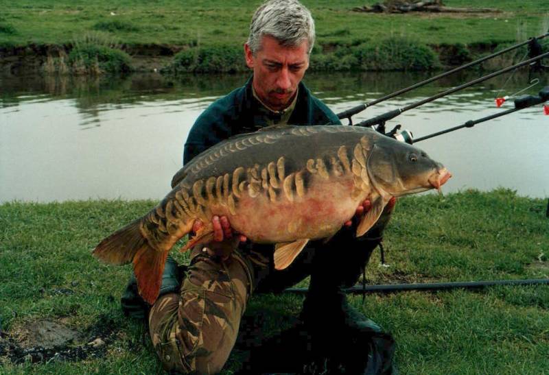 Deze vis blijkt een oude bekende die ik in het najaar van 1995 al eens had gevangen (toen 2 pond lichter en 3 cm kleiner) Ook nu vocht hij op de kant harder als in het water. Het kostte me 6 fotos met de zelfontspanner voordat ik er één had waarop de vis stil wilde liggen en ik niet met hem aan het worstelen was.