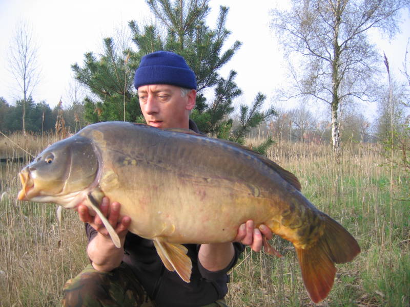wakker van een run. Het is de linker hengel en ik kan in het licht van de straatlantaarns al een schaduw ontwaren. Ik zie al snel dat het om een spiegelkarper gaat en ik schat hem op een kilo of tien. Als ik het net uit het water til blijkt dat ik er weer eens behoorlijk naast zit. Ik meet de vis op en als ik het meetlint tot 91 centimeter zie komen weet ik zéker dat het om een dertiger gaat. De vis weegt 16,2 kilo en mag overnachten in mijn bewaarzak. Om kwart over zes krijg ik weer een run op dezelfde hengel. Ditmaal is de weerstand veel levendiger en ik denk in eerste instantie aan een klein karpertje. Het blijkt een grote zeelt. Na dertien uur vissen houd ik het voor gezien en rijd via Lozen (waar Serge en Tom zitten te blanken) naar huis. Eindelijk weer eens een dikke vis na een behoorlijke tijd investeren en afzien. Thuisgekomen vergelijk ik enkele foto’s en kom erachter dat ik deze vis in 2000 ving met de pen op de paaltjesstek. Ik herken hem aan zijn papegaaienbek. Toen woog hij 12½ kg en was hij ook negen centimeter korter. Ik vind hem op dit gewicht wel mooier. First blood in de bak, who is next?