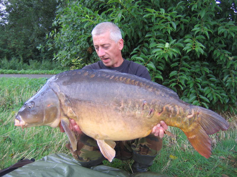 Op zaterdag 9 september vis ik een sessie op de lange kant met Brian. Het wordt een hele rare sessie. Brian krijgt om kwart over negen een run op zijn rechter hengel en landt een puntgave schub van 18,9 kg. Om even na tienen duiken we onder de wol. Ik heb nog steeds wat last van mijn rug (waarmee ik al sinds woensdag thuiszit) en Brian is doodmoe van een hele dag bezig zijn bij een kennis met sloopwerk. Om half twaalf krijg ik een run en sla aan. Ik zie op veertig meter uit de kant tot tweemaal toe een kolk terwijl ik zeker nog honderdtwintig meter verder lig. Dan breekt mijn hoofdlijn. Ik pak mijn derde hengel en vis op werpafstand verder. Om kwart over drie krijgt Brian weer een run en landt hij een hele mooie spiegel. Omdat deze door mijn linker lijn is gezwommen onthaak ik hem in het net en maak mijn nylonlijn los van zijn lood. Dan tilt Brian het net op de kant met veel gesteun en gepuf. Op de mat zie ik direct dat het een veertiger is, en wat voor een. Brian denkt dat het de “kleine leder” is. De vis doet die bijnaam in elk geval geen eer aan want hij weegt op een ons na 23 kilo. Wat een bak! Om half vijf is het de verre hengel van Brian die actie verraad. Hij krijgt de vis niet dichterbij en snapt er niet veel van. Dan komen we erachter dat hij een lijn heeft opgepikt. Op tien meter uit de kant blijft alles muurvast zitten. De vis zit aan de oppervlakte en kan niet dichterbij. Brian ontdoet zich van zijn broek en ondergoed en stapt in het water. “Het is best koud”, zegt hij. In het licht van mijn zaklamp zie ik dat hij gelijk heeft. Dan blijkt dat hij mijn lijn heeft opgepikt of liever gezegd, de vis die ik verspeeld heb is met de lijn achter zich aan verstrikt geraakt in de lijn van Brian. De schub aan zijn lijn is dus mijn vis. We wegen hem op 12,7 kilo en zetten hem terug. Ook de volgende ochtend krijg ik nog een keer actie. Om klokslag tien uur krijg ik een run midden in de kom. Het blijkt een graskarper. De nacht is in elk geval met actie voorbij gegaan. Een nacht met wat pech voor mij, maar met veel geluk voor Brian. Good angling en het is hem ook erg gegund, hoewel ik ze liever beiden zelf had gevangen.