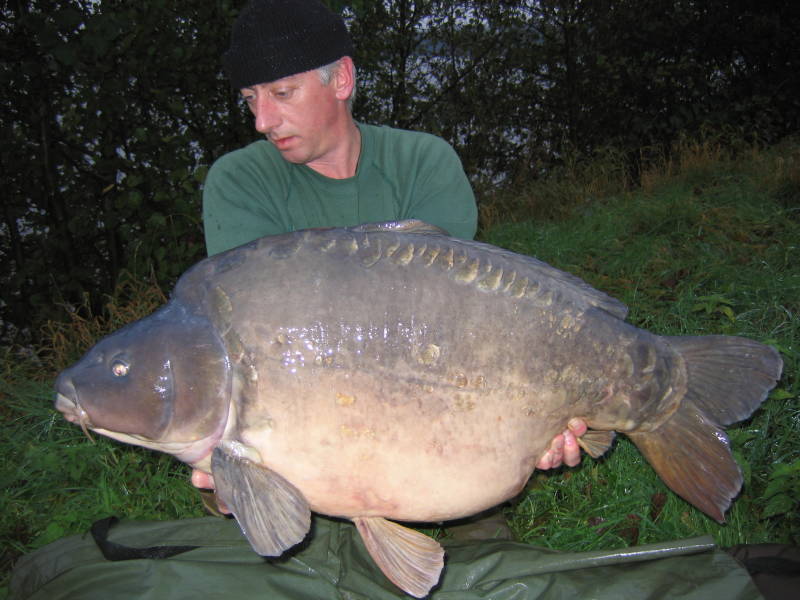Vrijdag 29 september rijd ik in mijn nieuwe auto naar de plas. Ik ben zo bezig met het ontdekken van allerlei knopjes dat ik de afslag mis en dat zorgt ervoor dat ik 4½ kilometer verder moet keren. Maar goed dat deze auto een stuk zuiniger is dan mijn Omega anders had het weer een liter benzine gekost. Enfin, om half vier liggen mijn hengels erin. Boilies en tijgernoten genoeg voor de komende dagen, enkele biertjes voor onszelf en mooi weer. We zitten op de brugstek en hebben er enorm veel zin in. Brian die al een dag eerder is begonnen heeft de eerste twee vissen van 14,5 en 14,8 kilo al binnen. Omdat we allebei erg moe zijn gaan we om tien uur slapen. In de eerste nacht vangt alleen Brian vis. We hebben veel herrie van een feest in de buurt en zo zitten we om één uur ’s nachts over het water te kijken. Een uur later krijgt Brian een run die hij verspeelt. Een uur en tien minuten later krijgt hij een herkansing en vangt een schubje van circa 7 kilo. Om vier uur gaan we weer slapen. Kwart over zeven word ik visloos wakker en besluit opnieuw te gaan uitvaren. Als ik de boot met aas en montage in het water leg, krijgt Brian een run op zijn kantstok. Na ongeveer tien minuten ligt er een werkelijk schitterende dubbele rijen van 19,1 kilo op de mat. Na de foto’s zetten we koffie en staren over het water naar activiteit. Overdag blijkt het water zo goed als dood. Er komt geen enkele aanbeet (niet eens van graskarper) en we zien ook niets springen. Tegen de avond draait er wat vis en hoewel we met alle hengels op andere dieptes vissen krijgen we geen enkele run. Ook deze avond gaan we rond tien uur slapen en ook deze avond worden we weer om één uur wakker gehouden door feestgedruis. Vanavond zit er zelfs nog wat weerlicht bij van een naderend onweer. Om half drie val ik eindelijk weer in slaap. De volgende ochtend word ik teleurgesteld wakker. Ik had echt een run verwacht en zit nu al twee nachten zonder vis. Dat stond niet in mijn draaiboek. Gelukkig komt de stek tegenover de grote kom vanochtend vrij en kan ik om elf uur verkassen. Ik trek de haringen uit mijn tent, pak de tent die nog volledig ontplooid is op mijn nek en wandel naar de stek die zo’n 60 meter verderop ligt. Hij past nét tussen de bomen door. Om half een liggen mijn hengels weer op een nieuwe stek. Omdat het een stuk harder is gaan waaien is het enorm druk met surfers. Er suizen er vijftien over de plas en er vaart ook een zeilboot tussen. Met windkracht zes krijg je de kans niet om je hengels uit te varen want ze varen je voerboot en lijn in een mum van tijd aan gort. Zowel Jan, een vismaat van Brian, Roel, een vismaat van mij als Geert Ooms komen achtereenvolgens langs voor een praatje. Het bier gaat wel snel op zo. Om zeven uur komt Bart langs. Bart is een zeventienjarige Belg die ook op deze plas vist en in de buurt woont. Hij laat foto’s zien van zijn laatste veroveringen waaronder een spiegel van ruim 21 kilo en de leder op 19,8. Om half acht, het is net beginnen te regenen en in de verte naderen de flitsen van een onweer, krijg ik een hele trage run. De dril duurt ruim twintig minuten en de vis aan de andere kant doet me regelmatig doodsangsten uitstaan. In eerste instantie neemt hij al behoorlijk wat lijn. Ik vis op een afstand van 220 meter in de kom maar daar voegt hij zeker een meter of tien aan toe. Vervolgens zwemt hij helemaal naar links en ik ben bang dat hij over de lijnen van Brian heen gaat. Gelukkig is die angst ongegrond en verloopt het gevecht redelijk rustig totdat de vis op zo’n tachtig meter uit de kant is. dan is hij het beu en neemt weer een lange trage run. Enkele minuten later gaat hij achter het talud gewoon stil liggen en moet ik extra druk uitoefenen om hem op het talud te krijgen. Weer neemt hij lijn, weer zwemt hij traag van rechts naar links en dan weer van links naar rechts en weer gaat hij liggen mokken achter het talud. Daarna is het gevecht relatief snel afgelopen. Hij draait nog enkele rondjes voor de hengeltop en blijft constant diep. Het logge gevaarte laat zich nauwelijks beïnvloeden door mijn hengel, laat staan door mijn inmiddels knikkende knieën. Even later zie ik met een zucht van verlichting de vis over het koord van het landingsnet glijden. Hij zit erin. Inmiddels is het donker geworden en schijnen we met een zaklamp in het net. Tjeezus, wat is hij groot en vooral breed. Brian meent de vis te herkennen als “de gespleten staart”, een vis die hij vorig jaar augustus ving op 23,2 kilo. Een vis die hooguit eens per jaar op de kant komt. De vis staat helemaal strak en vult zowat mijn hele onthaakmat. Het is een hele vette schub en blijkt inderdaad “gespleten staart”. Ik vraag Brian om zijn weegzak te pakken omdat die wat sterker is dan de mijne. Ondertussen meet ik de vis op 93 centimeter. Als we daarna de vis wegen blijft de naald op exact 25 kilo staan. Ik heb een vijftiger gevangen!