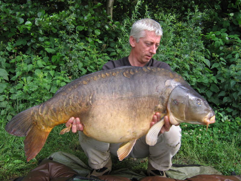 super blij. Niet alleen omdat de vis binnen is, maar het is ook nog een grote én een spiegel op de koop toe. Als ik Brian gewekt heb doen we samen de weegceremonie. Ik schat hem veertig pond, maar hij weegt 2 ons lichter. Het kan me niet schelen. Het is een supervis die na een verschrikkelijk mooie dril op de kant is gekomen. Met 92 centimeter is het al een respectabele vis, maar de buik die eronder hangt maakt dat de vis echt respect afdwingt met zijn verschijning. De vis heeft enkele krassen en mist ook een paar schubben. Toch hebben ze volgens mij nog niet volledig afgepaaid. Na de fotosessie mag de vis weer zwemmen. We drinken een kop koffie en gaan tegen tien uur inpakken. Ik ga met een goed gevoel naar huis. Volgende week naar de Paal en op de valreep toch nog vis in mei. Goed dat ik dat plastic zakje kon verwijderen, want het was juist de hengel aan de overkant die nu vis opleverde. De nieuwe boilie lijkt het ook goed te doen. Redenen genoeg om het allemaal weer wat positiever in te zien voor de komende tijd.