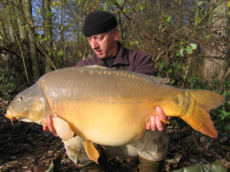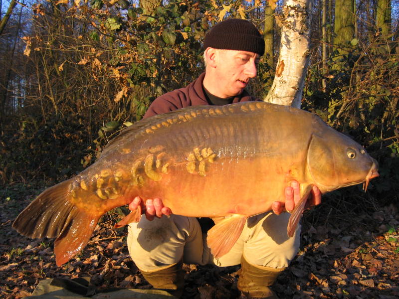 Een week later vis ik de nacht van 2 november. Niet op de viersprong maar onder de eerste brug daar vandaan in Nederweert. Helaas blijf ik ook deze nacht visloos. Ik rijd naar de spoorbrug en ondervind een kopie van de sessie van vorige week. Ook deze keer krijg ik na 20 minuten enkele stoten op mijn rechter hengel en zet de beet niet door. Na 55 minuten is het wél raak. De middelste hengel geeft aan dat er wat loos is en na vijf minuten schuif ik het net onder weer een spiegel van een kilo of tien. Het blijkt een oude bekende. Gezwelletje, en hij is gegroeid ook. Sinds ik hem ving in december 2005 is hij ruim verdubbeld in gewicht. Hij woog ditmaal 10,4 kilo en met 75 centimeter bleek hij er 12 gegroeid. Minder mooi dan het visje van vorige week maar bijzonder welkom. Hij had overigens op zijn flank een oude wond en het gezwel op zijn kieuwdeksel was nog steeds aanwezig. Hij wordt er niet mooier op zullen we maar zeggen. Volgende week maar weer eens een dagsessie draaien op de Paalse plas. Maandag hoor ik het vonnis van het nachtvissen in april. Ik ben heel benieuwd.