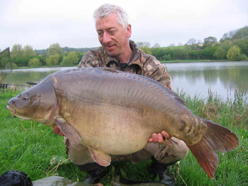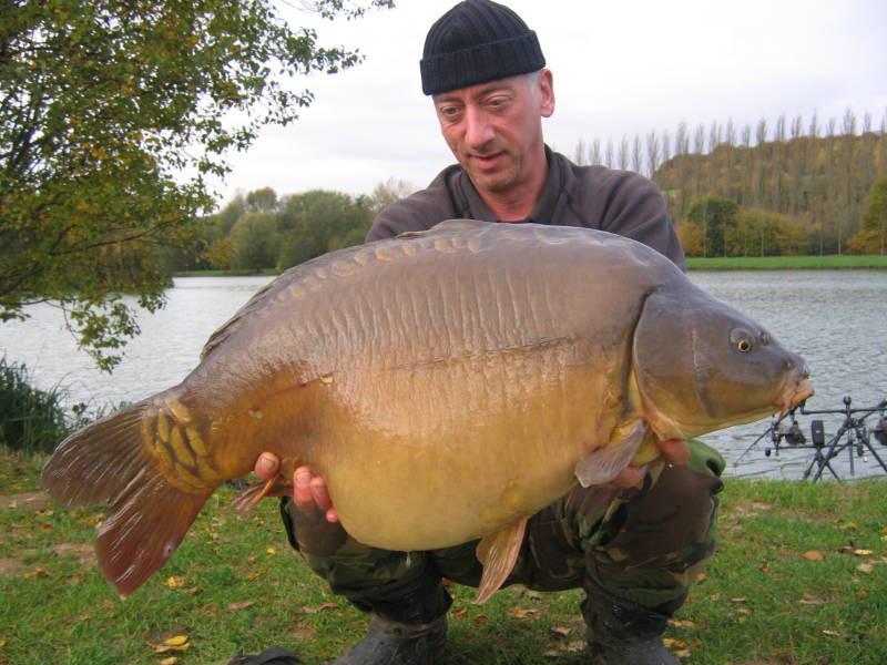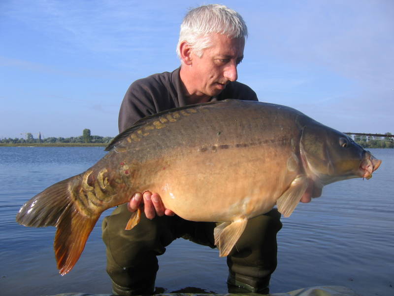 verlossende aanbeet op mijn verre stok. Na een mooie dril zie ik de vis aankomen in het kristalheldere water van de plas. Het lijkt een goeie. Als ik hem in het net de kant op til weet ik dat ik er weer een dertiger bij heb. Met 15,6 kilo en 93 centimeter een goede gok. Als ik de spullen klaar wil zetten voor de fotosessie, dendert de vis van de mat af en zo uit de weegzak terug het water in. Gelukkig weet ik hem nog net op de kant te krijgen. Maar goed dat het hier niet zo diep is aan de kant. Na wat foto’s met de zelfontspanner mag hij weer zwemmen. Moraal van dit verhaal; Shit happens, maar geluk ook! Ik vind dat ik met mijn doorzettingsvermogen en ondanks alle tegenslagen deze vis dik verdiend heb. Nog twee weken en dan rijden we weer naar Frankrijk voor een avontuur in hetzelfde dorp als in het voorjaar.