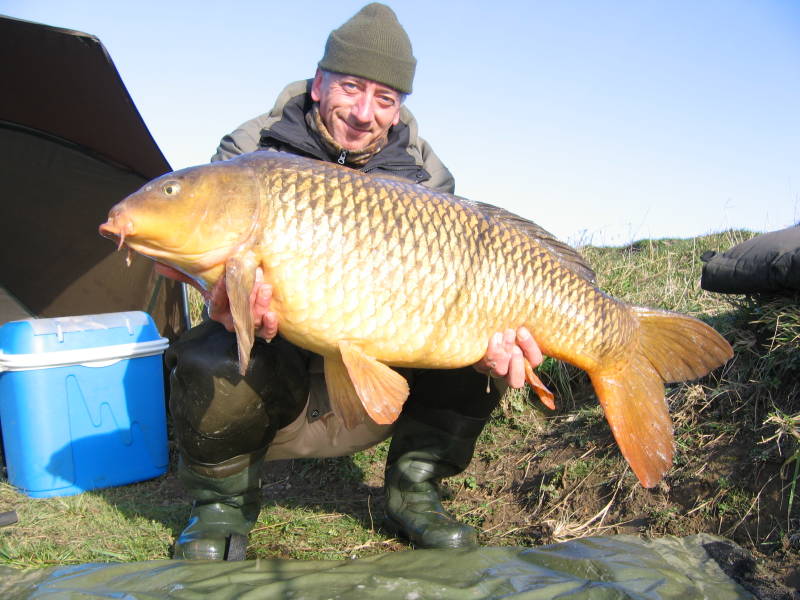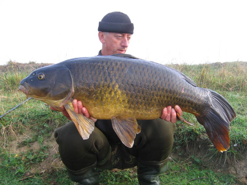 Na een erg korte nachtrust van 3 uur loopt mijn wekker af. Ik vaar beide stokken uit en kruip weer in de zak. Om half acht word ik wakker en merk dat er niets meer gebeurd is. Ik ga koffie zetten en kijk over het water. Rond acht uur belt Brian. Terwijl ik met hem aan de telefoon zit zie ik een goede vis op de linker kop tweemaal uit het water komen. Ik besluit mijn rechter hengel te verplaatsen. Tien over tien krijg ik een run en vang na een rustige dril een rijen van 11,6 kg. De rest van de dag is het graskarper wat de klok slaat totdat ik om drie uur weer een echte karper voel als ik aansla. De vis zwemt rustig mee, maar koerst vooral naar rechts. Even slaat de twijfel toe of hij achter het eiland langs gaat of toch aan mijn kant zit. Gelukkig zwemt de vis aan de goede kant, tenminste voor mij, maar hij houdt niet op met zwemmen. Hij zwemt het paaigedeelte in en duikt aan mijn eigen kant tussen de takken. Ook nu voel ik de lijn schuren en even later weer losschieten. Het volgende obstakel is een paaltje waar de vis net langs zwemt en ik ternauwernood met hoog opgeheven hengel kan voorkomen dat ik de vis daarop verspeel. Het voelt als een goede vis en ik ben licht teleurgesteld als ik even later zie wat er in mijn net ligt. Een stokbrood met een grote staart. Negentig centimeter en slechts 11,3 kilo. Met drie vissen op mijn palmares rijd ik naar huis. Dik tevreden.