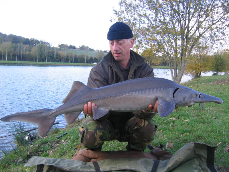 Zaterdag 31 oktober verlaat ik de 25 jarige bruiloft van Charrel en Do al om 23.30 uur. Vijftig minuten later ben ik onderweg naar Frankrijk. Eerst ontmoet ik Bjorn op een parkeerplaats bij Roosteren en na een snelle bak koffie rijden we elk in onze eigen auto naar Frankrijk. Vijf voor half zes komen we aan bij het water. We zijn redelijk brak van de rit en besluiten een rondje rond het water te lopen. Er zitten nog 3 vissers. Twee bij het eiland en een aan de overzijde. De stek waar we willen starten in het weiland is nog vrij, hoewel de fransman aan de andere kant van het hek Bjorn wel afstopt. We drinken een biertje op een goede vangst (het is tenslotte pas half zeven) en gaan naar de stek. Half negen liggen de hengels erin. De Fransman heeft gezegd in de middag te vertrekken en dat is voor ons voldoende. Een uurtje later probeer ik een dutje te gaan doen maar dat lukt niet. Teveel adrenaline en hoopvolle verwachting voor een nieuwe sessie. Het is grijs en grauw weer, het miezert, het water is 12½ graden en er waait een stevige zuidenwind, kracht 5 schat ik. De hele dag gebeurt er niets hoewel we aan de overzijde regelmatig vis uit het water zien komen. Als alle andere vissers weg zijn ga ik uitvaren. Eerst mijn eigen hengel naar de linkerzijde van het eiland, daarna die van Bjorn. Als ik gedropt heb en terug wil varen stuur ik de verkeerde kant op en zit ik vast. Muurvast!!! Vooruit, achteruit niets helpt. Ik baal als een stekker. We rijden om naar de andere kant om te zien of de boot zwemmend te bereiken is, maar we besluiten het uiteindelijk niet te doen. Ik vind het onverantwoord om een leven op het spel te zetten voor een speelgoedbootje. Ik ga de volgende dag wel op zoek naar een supermarkt om een rubber bootje te kopen en dan halen we hem daarmee wel op. De volgende ochtend is er bij mij op visgebied niets gebeurd. Bjorn heeft onder mijn voerboot een vis gevangen van 27 pond. We besluiten aan de overkant te gaan zitten omdat daar veel meer activiteit te zien is van karper. Als ik alles in de auto heb geladen besluit ik direct door te rijden naar de supermarkt om een bootje te kopen. Drie supermarkten later is mijn vertrouwen op een goede afloop aardig de grond ingeboord. Het kampeerseizoen is over en er worden nergens bootjes meer verkocht. Bij de laatste supermarkt hebben ze wel een luchtbed. Wel duur hoor, € 40,00 voor een rubber vlot. Maar ja, toch maar doen want mijn voerboot kostte 1200 Euro meer. Om elf uur liggen de hengels er weer in en ben ik aan ’t vissen. Een uurtje later meldt de eerste vis zich, maar die zwemt zich vast in het wier en de haak lost. Kut. Dat kan er ook nog wel bij. Gelukkig krijg ik ’s middags om half vier weer een herkansing. Deze keer gaat alles goed en de dril verloopt zwaar maar goed. Als de vis zich voor het eerst laat zien begin ik te lachen. Een steur. Die wilde ik graag nog toevoegen aan mijn rijtje bijvangsten. Even later ligt er een