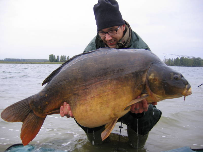 Een spiegel van 87 centimeter en 14,9 kilo. Een mooie vis en hopelijk het startschot voor meer vissen. Dan zie ik dat de rechterarm van mijn landingsnet gebroken is en helaas komt er deze sessie ook geen vis meer bij voor mij. Bjorn vangt in de laatste nacht nog een spiegel van 17,4 en een schub van 12 kilo als hij omstreeks half drie een dubbele run krijgt. Dat kost hem overigens nog bijna een hengel. De hengel die hij eerst aansloeg had hij teruggelegd op de steunen omdat een andere hengel nog volop lag te piepen. Toen de eerste vis de rek uit de lijn had gezwommen schoot deze hengel naar voren en bleef nog nét achter de beetmelder hangen. Dubbel geluk dus voor hem. Woensdag rijden we weer naar huis. Een ervaring rijker maar zonder de geweldige sessie die ik in mijn hoofd had zitten. Vismeelknikkers hadden het hier moeten doen samen met vismeelpellets. De zoete boilies die wij bij ons hadden waren aas van een minder slag. Bjorn mocht daarbij van geluk spreken dat in zijn sector veel vis rondzwom. Met drie dertigers, twee twintigers en een steur heeft hij me in elk geval een behoorlijk poepje laten ruiken. Ik wil nog wel eens terug met de kennis die ik deze drie dagen heb opgedaan. Voor de € 76,- die het me nu kostte, hoef ik het in elk geval niet te laten.