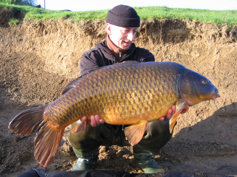 Een week later vis ik de laatste nacht van oktober van zaterdag op zondag. Hoewel ik een voorkeur heb voor de vrijdag moest ik wel op zaterdag gaan want Bjorn kon niet. Helaas belde hij vervolgens ook nog af voor de zaterdagnacht omdat hij met een klant naar het voetbal moest. Hij baalde als een stekker en wenste me succes. Omdat ik al om vijf uur vertrokken ben, heb ik mijn hengels er al om kwart over zes in liggen. Toch begint het al te schemeren. Vannacht wordt de klok verzet en dat betekent dat het volgende week nog eerder donker is. Nou ja, eerst vannacht nog maar eens proberen een visje te vangen. Bjorn heeft keurig drie dagen op rij gevoerd en ik verwacht in elk geval actie. Ik kruip met een boek en een biertje op mijn stretcher en lees wat in een karper boek bij het licht van mijn koplampje om de tijd te verdrijven. Het is een stuk kouder dan de weersverwachting voorspeld had en om half negen besluit ik lekker in mijn slaapzak te gaan liggen. Mijn laarzen liggen klaar om er snel in te kunnen en ik draai me lekker in een comfortabele houding. Half elf gaat de telefoon. Bjorn vraagt of het al wat is, ik antwoord ontkennend. Ik had eigenlijk stiekem al wat actie verwacht en houd me maar vast aan het idee dat het vorige week ook pas rond middernacht gebeurde. Om kwart over drie begint het te regenen. De weersverwachting had ook al gemeld dat het droog zou blijven, dus daar zaten ze ook al naast. Verder slaap ik de hele nacht door totdat ik om vijf uur drie piepen krijg op mijn diepe hengel, de rechtse dus. Ik kijk enkele seconden en krijg dan weer drie piepen. Net als ik besluit dat het wel drijfvuil zal zijn, fluit mijn hengel ervandoor. Snel mijn laarzen aan en dan de hengel oppakken. Het voelt allemaal niet zo spannend aan de andere kant van de lijn, dus ik dril stevig. Zeker als de vis zich naar mijn gevoel vast zwemt in het wier. Ik voer de druk op tot ik de hengel in het handvat voel buigen en krijg de vis weer op gang. Het scheppen gaat de eerste keer direct goed. Tot mijn grote verbazing is het een lange spiegel die, als hij op zijn kant ligt, nog meer verbazing op mijn gezicht tovert. Dit is gewoon een hele dikke vis. Aan de unster laat hij zien dat ik me behoorlijk vergist heb tijdens de dril.