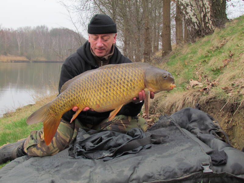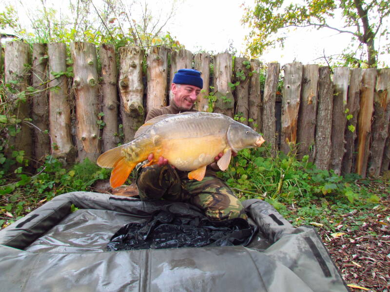 Op zondag de 4e november rijd ik rond de klok van zes uur de oprit af. De auto is volledig bepakt en op mijn stoel naast me staat een volle thermoskan koffie. De reis verloopt spoedig en ik stop onderweg twee keer. Ik heb tijd genoeg dus steeds terwijl ik pauzeer laat ik tot me doordringen dat ik vakantie heb en dat ik onderweg ben naar Frankrijk om te vissen en vooral om tot rust te komen. Na exact vier uur en vijfendertig minuten sta ik voor de poort van het complex. Ik maak de poort open en loop het terrein op. Een hond blaft en waarschuwt de eigenaar van het complex dat iemand het terrein op komt. Even later zwaait de deur van de woonstee open en komt Steve naar buiten. Hij begroet me en vertelt dat ik maar een plekje moet zoeken. De plek die ik het liefst hebben wil is vrij en dat komt me goed uit. Op mijn vraag of ik een boot kan gebruiken, antwoord hij dat ik er maar eentje moet pakken. De peddels en een reddingsvest liggen in de bunker. Ik rijd om het water heen dat tussen de bomen ligt. De bladeren zijn mooi gekleurd en het is heerlijk om hier te zijn. Als ik aan de overzijde van het water sta, op de plek die ik wil bevissen, kleed ik me om in mijn visserskleren en loop ik naar de bunker voor een boot. Ik vaar naar mijn stek en pak mijn peilhengel en een volle emmer boilies. Dan steek ik van wal en ga op zoek naar enkele mooie plekken om mijn aas neer te leggen. Recht voor mijn stek staat zo’n twee meter water. Naar rechts wordt het veel ondieper en naar links zitten Engelsen aan de overkant, die ik niet teveel in de weg wil zitten. Ik voer alles bij elkaar zo’n vijf kilo boilies, want er zit toch heel veel vis hier, en vaar terug naar mijn stek. Om half drie liggen mijn hengels erin en kan mijn sessie beginnen. Het enige wat me tot nu toe tegenvalt, is de watertemperatuur. Met 9½ graad, is dat eigenlijk te koud voor de tijd van het jaar. Het meerjarig gemiddelde ligt op elf graden. Als een uurtje later mijn kamp is opgezet, maak ik een filmpje en drink ik een biertje om de sessie “formeel” te openen. De eerste nacht gebeurt er helemaal niets. Links van me hoor ik enkele vissen uit het water springen en terugvallen. Daar zit minstens een goede vis bij. Ik ontbijt op z’n Engels met bacon, eieren en bonen. Daarna meet ik opnieuw de watertemperatuur die nu zelfs teruggevallen is tot onder de 9 graden. Het zal niet makkelijk worden. De andere drie vissers op het water, allemaal Engelsen, hebben met een nacht meer ook nog steeds geen vis op de kant gehad. Alleen Patrick die in de grote baai zit heeft vannacht een vis gelost door lijnbreuk. Ik voer in de ochtend nog drie kilo boilies bij als ik de boot terugbreng. Overdag schijnt er een beetje zon tegen mijn oever, maar de vis wordt er niet door geactiveerd. Ook de tweede nacht gaat visloos voorbij en ik ben bang dat ik teveel gevoerd heb. Ik besluit om in te pakken en te verhuizen naar de zuidkant van het water. Daar heb ik beter overzicht en zit ik ook dichter op de vis die ik ook deze nacht weer heb horen springen. Het is inmiddels dinsdag en de helft van de sessie zit er al op, terwijl ik nog steeds visloos ben. Na enkele uurtjes zwoegen staat het kamp op de nieuwe plek en liggen de hengels op nieuwe stekken. Patrick, de Engelsman die in de grote baai achter me zit, is een aardige vent van 49 met een grote rode baard. Dat is ook wel een positief verschil met de twee dagen stilte die ik achter de rug heb. Een beetje aanspraak en af en toe een kop koffie of thee, is een stuk gezelliger. Die avond krijg ik om vijf over zes mijn eerste aanbeet. Helaas verpruts ik die volledig. Ik had mijn hengels wat verder op de kant gezet zodat alleen de hengeltoppen over de paaltjes heen staken, maar had er niet aan gedacht wat er gebeurt als je met toplood vist. Bij een aanbeet kromt de top zich richting lood, dus bij het oppakken van de hengel breekt de hoofdlijn doordat deze achter een paaltje blijft hangen. Kut, kut en nog eens kut. Mijn eerste aanbeet na 50 uur vissen en hem dan zo verspelen. De volgende ochtend vaar ik mijn hengels opnieuw uit en voorzie de meest rechter, op aanraden van Bjorn, van sweetcorn. Na anderhalf uur krijg ik hier een run op maar voordat ik de hengel kan oppakken is het al over. Slechts een grote boeggolf geeft aan dat het toch echt om karper gaat. Aan het begin van de middag, gooien Patrick en ik wat met een plugje rond. Er jaagt vee snoek en het duurt dan ook niet lang of we hebben er allebei eentje. De mijne is met 75 centimeter net iets groter dan die van hem, maar even later wint hij de wedstrijd door er nog een bij te vangen. Om kwart over drie gebeurt het dan eindelijk. Mijn “blauwe” hengel loopt af en na een dril van enkele minuten kan ik het net onder een lage twintiger schuiven. Wel een hele mooie trouwens. Volop in winterkleuren, mag de vis even later poseren op de foto. Omdat inmiddels mijn laatste avond is aangebroken, nodig ik Patrick uit om een biertje te drinken samen. Rond half zeven zitten we onder mijn oval, met de kachel tussen ons in. Om negen uur krijg ik weer een run op mijn maishengel die tijdens de dril ook nog een van mijn andere lijnen oppikt. Als de vis klaar is om geschept te worden, lost ineens de haak. Gelukkig was het maar een kleintje, anders had ik echt enorm gebaald. Nu kan ik er zelfs om lachen. Half elf ga ik pitten en dan is het ineens ochtend. Ik ruim op mijn gemak op, hopend op nog een aanbeet, maar die blijft helaas uit. De twee Engelsen aan de overkant zitten vol op de vis. Ze vissen in de richting van mijn oude voerstek en hebben inmiddels in de laatste anderhalve dag 18 vissen gevangen. De zwaarste weegt 34 pond. Ik had beter kunnen blijven zitten op stek 1. Half elf rijd ik de poort weer uit. Licht teleurgesteld maar lekker uitgerust. Ik wil eigenlijk nog wel eens terug naar dit water, maar dan met andere temperaturen.