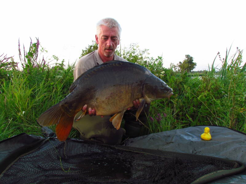 Op donderdag 25 juli begint mijn vakantie, nou ja, ik doe nog wat telefoontjes en wat mail, maar heel erg druk maak ik me niet meer. Het is de laatste weken enorm druk geweest en de fut is eruit. Na het avondeten rijd ik naar de haven en laad mijn boot in. Vanwege het tropische front, waarin we al tuim een week zitten, besluit ik naar een stek te varen waar veel zuurstof in het water komt. Om acht uur liggen mijn hengels op de steunen. Eentje wijst er naar de stuw, de andere naar de haven van Linne. Bij het optuigen ben ik van een hengel al de hele montage kwijtgeraakt. Er liggen veel keien hier. Ik verwacht wel een aanbeet en zowel Bjorn als Ruud denken dat ook. Totdat ik naar bed ga gebeurt er niks. Om een uur krijg ik een oploper bij het muurtje. De waker blijft bovenin staan en de top licht gekromd. Als ik de hengel oppak voel ik direct de lijn breken. De rest van de nacht gebeurt er niets meer en als ik ’s ochtends tijdens de koffie naar het weer kijk op mijn iPad, zie ik dat er om negen uur een vet onweer gaat losbarsten. Ik begin dus om acht uur op te ruimen en als ik om negen duur de klep van mijn auto open doe, begint het lichtjes te druppelen. Net op tijd dus. Weer geen vis, verdorie. Het enige lichtpuntje is dat ik een gloednieuwe paraplu vind, met steunen en grondzeil. Helemaal compleet dus ga ik niet helemaal zonder iets naar huis. Het is geen topmerk, maar goed genoeg om in de caravan neer te leggen en daar te laten liggen. Een gegeven paard..., toch? Mijn volgende sessie plan ik ergens begin volgende week. Eens zien waar ik heen ga. Waar ik heen ga, werd voor mij opgelost door een telefoontje van Bjorn op zondag. Hij belt me tussen de middag op om te vertellen dat er redelijk wat vissen liggen op de ondiepe stek in Asselt. Omdat ik toevallig toch al besloten had om die nacht te gaan, wijzigde ik de bestemming van het kanaal naar Asselt. Ik ben om vijf uur op de stek en heb een kwartier later mijn hengels erin liggen. Twee op de rodpod en twee verscholen in het riet, links en rechts van me. Hoewel het vandaag minder warm is dan de afgelopen dagen, is het toch warm genoeg om me te laten zweten. Na het opzetten van mijn kampement, neem ik een biertje en puf uit. De verwachtingen zijn hoog gespannen en ik verwacht al snel vis. Bjorn, die me belt om succes te wensen, verwacht dat ik binnen het uur vis op de kant heb. Niets is minder waar. Het wordt zeven uur, acht uur en nog steeds geen vis. Ik sms Bjorn dat het waarschijnlijk wel weer niks zal worden en dat de vis lijkt te zijn weggetrokken. Om zeven uur zag ik er nog eentje enkele keren springen vlakbij het roeibootje, maar daarna is alles rustig gebleven. Bjorn zegt dat ik dat ook moet doen, rustig blijven, en dat er nog best wat gaat gebeuren. Om vijf over negen is het zover. Mijn linker hengel op de rodpod gaat er na enkele piepen van tussenuit. Na een stevige dril in het ondiepe water kan ik het net onder een spiegel steken. Zo die is binnen. Ik schat de vis tussen de twaalf en dertien kilo en dat blijkt exact juist. Met 81 centimeter is het geen reus, maar wat is deze vis welkom na weken blanken. Ik maak een paar foto’s en zorg dat onze mascotte, een geel badeendje, ook op de foto staat. Daarna gooi ik opnieuw in met een funnelwebje vol gebroken boilies en een foampje op de haak. De rest van de avond gebeurt er niets meer en om half elf besluit ik te gaan slapen. Om half drie krijg ik een volle fluiter op mijn rechter hengel op de rodpod. In eerste instantie denk ik aan een dikke vis, maar hoe langer het gevecht duurt, hoe zekerder ik ben dat het om een kleintje gaat. Vlak voor de kant lijkt het wel een winde en het duurt niet lang voordat er een frikadelletje het net in glijdt. Het beestje meet maar liefst 66 centimeter en ik vind het de moeite niet waard om het arme beest te wegen en te fotograferen, dus hij mag snel terug. Dat is twee. De volgende ochtend ben ik om half zes wakker en ga, op mijn laatste vangsthengel na, al mijn hengels opnieuw ingooien. Om zes uur ben ik daarmee klaar en ga aan de koffie. Helaas gebeurt er niets meer deze ochtend, maar het hoeft ook niet. Ik ben tevreden en kijk naar een mooie zonsopkomst terwijl ik mezelf een dosis nicotine en cafeïne toedien. Tien uur rijdt een tevreden man over het zandpad naar huis. Ik denk dat ik de komende week nog een nacht ga doen op woensdag of donderdag. Dan zal het waarschijnlijk wel het kanaal worden, want ik heb goede ideeën bij de binnenbocht en daar mag ik ook legaal met vier hengels vissen. Dat voelt toch beter, waarschijnlijk.