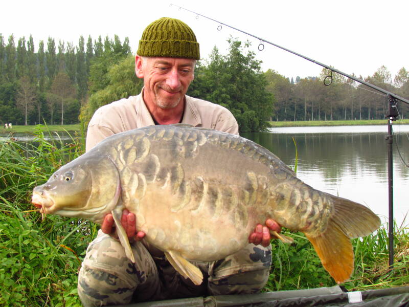 Omdat ik zelf mijn beste vriend ben, vind ik het ook niet heel erg om de komende dagen alleen te zijn. “Le President” komt langs voor de vergunning en dan is alles oké. Ik verspreid vijf kilo boilies met de voerpijp, één voor één anders haal ik de afstand niet, van links naar rechts over een breedte van zo’n 120 meter. Lekker open vissen en de karpers laten zoeken. Voordat ik ’s avonds ga slapen voer ik nog twee kilo. Dat wil ik de komende dagen blijven doen, maar ik merk dat het zwaar is om de boilies per stuk op de stek te krijgen. Er gaan er 200 in een kilo. Man, mijn arm is aardig verzuurd als ik de slaapzak in kruip. Midden in de nacht krijg ik een aanbeet en vang een mid twintiger schub. Die mag direct terug. Ik ben bekaf en kan het niet opbrengen om van mijn eerste vis een foto te maken. Er zullen er nog wel meer volgen. Die ochtend is het spitsuur en voor twaalf uur vang ik nog vier spiegels. De laatste weegt zelfs 33 pond en dat is een nieuw PB voor mij op dit water. Tussen de middag bak ik eieren met spek en knoop tien nieuwe onderlijnen. Dan is het tijd voor een dutje. Om half drie begin ik wat actiever te worden en vraag me af waarom er niks gebeurt. Je raakt toch gauw verwend als het loopt. Om drie uur ’s middags loopt mijn eilandhengel af. Als ik de vis voor mijn voeten zie zwemmen, slaat de schrik me om het hart. Een hele mooie, zwaar beschubde en licht gekleurde spiegel die ook zeker over de dertig pond gaat. Deze mag ik niet verspelen. Met een zucht van verlichting trek ik de vis even later het landingsnet in. Pfff, die is binnen. Wat een plaatje van een vis zeg. Ze meet 87 centimeter en weegt ruim 16 kilo. Gewicht is altijd relatief bij het aanschouwen van zo’n mooi beschubde vis, maar het helpt wel degelijk mee. Om kwart over vijf vang ik zelfs een zevende karper. Alweer een spiegel en alweer een vis van in de twintig pond. In het voorjaar ving ik hier vooral kleinere vissen en nu ligt het gemiddelde gewicht toch een stuk hoger. Ik maak weer een aantal mooie foto’s en het valt me alweer op dat de vissen op dit water altijd zo fantastisch van kleur