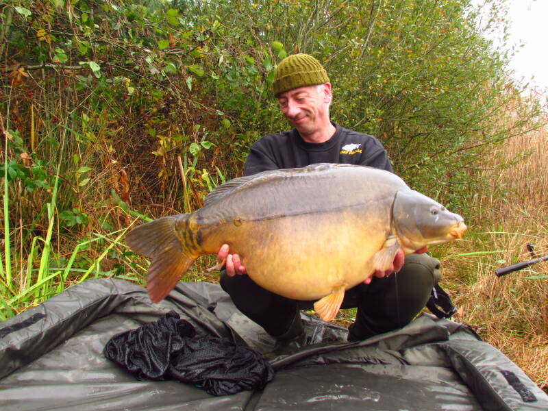 Op vrijdag 18 oktober, vissen we weer een nacht op de Bramenput. Bjorn heeft dinsdag en woensdag gevoerd en ik de donderdag. We zijn al om half zes aan het water en om zes uur liggen mijn beide hengels erin. We doen een gezamenlijk biertje bij Bjorn en vertellen elkaar over onze Frankrijksessies. Rond tien uur gaat het licht uit en kruip ik in mijn slaapzak. In de ochtend is de koffie bij mij. Ik heb net het vuur aangezet voor een tweede bakkie, als Bjorn een beet krijgt. Hij rent naar zijn hengel en maakt contact. Gedurende de dril zijn we allebei gespannen en als er even later een vette spiegel over het koordje van het net glijdt, zuchten we van opluchting. Het lijkt geen lange vis maar er hangt een behoorlijke pens onder. Als de vis even later toch meer dan 90 centimeter lang blijkt te zijn, weten we dat dit een goeie veertiger is. De unster vertelt ons dat hij er met 3,4 kilo overheen gaat. Mooi resultaat, maar toch maar weer een enkele vis deze nacht. Volgende week mag ik weer op de hotspot. Ik ben benieuwd of die dan weer een vis oplevert. Eerst ben ik nu aan de beurt om komende week twee keer te voeren.