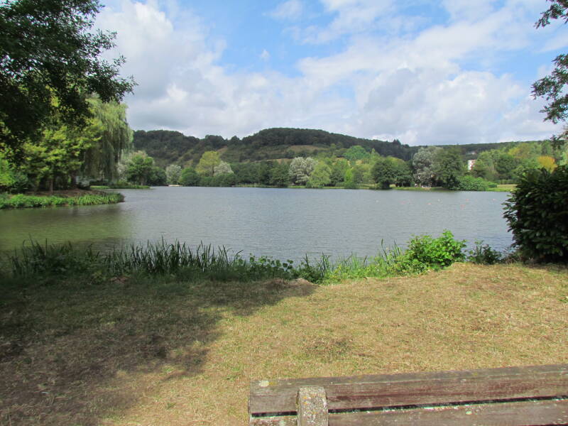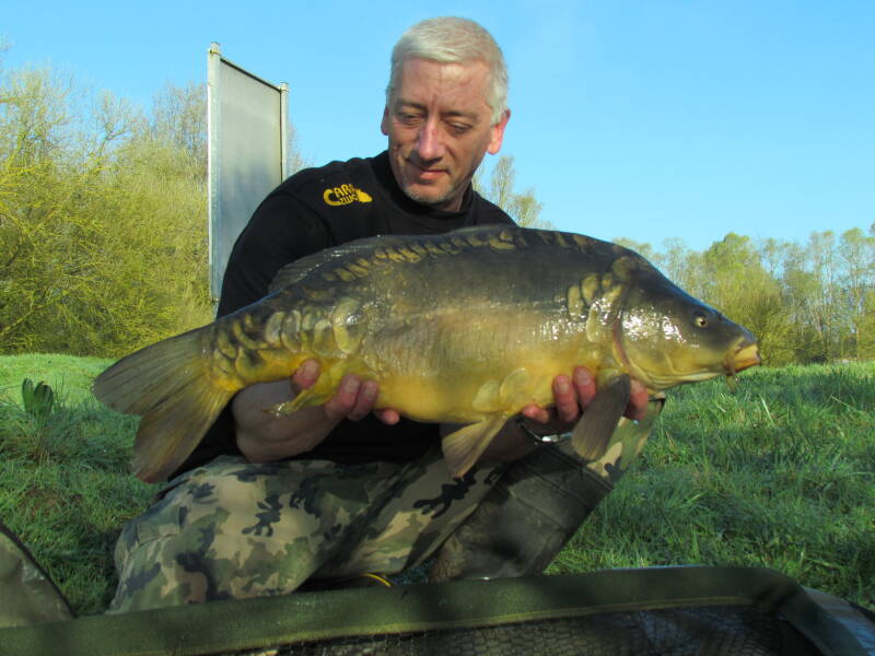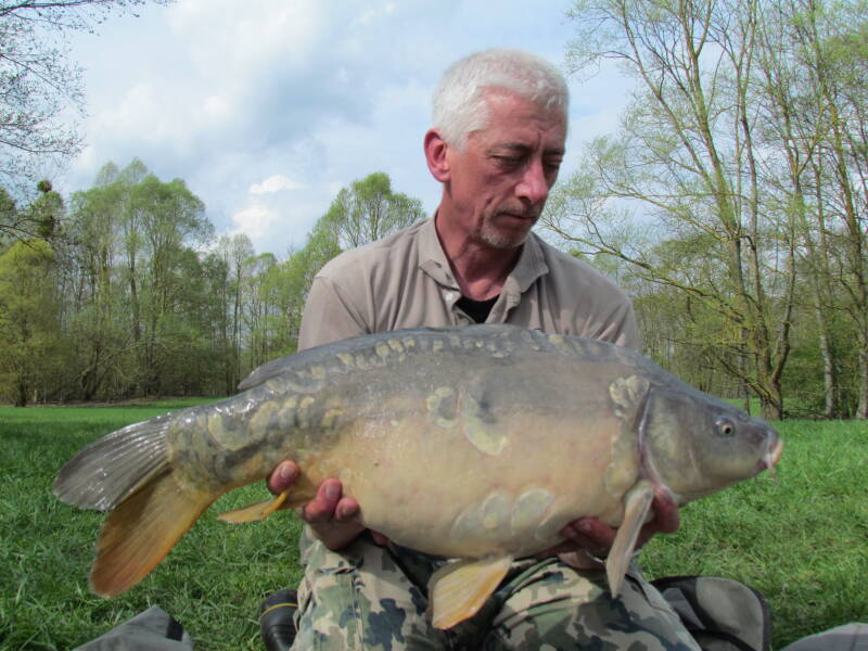 Op dinsdag de negende vis ik mijn eerste sessie in Prémery. Ik heb op maandag en vandaag aan het einde van de ochtend wat gevoerd en besloten tussen de struiken van de tennisbanen te gaan zitten. Nachtvissen is hier immers verboden. Om acht uur zit ik half geïnstalleerd langs het pad. Half, omdat de hengels weliswaar op de juiste plekken liggen, maar de oval en stretcher staan wat uit zicht te wachten tot het donker wordt. Rond tienen worden ook zij geactiveerd en dan ben ik klaar voor de nacht. De klamboe laat ik achterwege. Het is tien voor twaalf als mijn rechter kanthengel een aanbeet verraad. Het lijkt wel een leder, maar het blijkt toch een kale spiegel van net onder de twintig pond. Een half uur later is het de linker kantstok, waarop ik een zwaarder beschubde spiegel vang. Een soort van semi-warrelrijen. Het visje is een kilootje of twee lichter dan zijn voorganger. Om drie uur vang ik zelfs nog een derde, weer een kale spiegel rond de acht kilo, en dan is het afgelopen. Wat me opvalt is dat er bij daglicht niks gevangen wordt, dus moet ik wat verzinnen. In de middag bij het boodschappen doen haal ik wat "wolkend" spul, vogelvoer, gecondenseerde melk en kattenbrokjes voor een opvallende zig mix. Eens kijken of ik daarmee wat kan afdwingen tijdens de uren dat het licht is. Wat ook nog opvalt is dat de vissen licht van kleur zijn en er niet heel gezond uit zien. Te veel slijm en te bleek.
