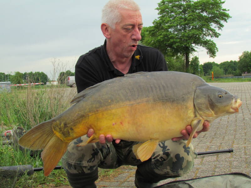 Als ik zondagochtend vroeg beneden kom en buiten ga roken, merk ik dat er een warm broeierig windje staat. Er hangt regen in de lucht, maar de omstandigheden maken dat de kans op vis vandaag zeker niet ondenkbeeldig is. Ik gooi de spullen in de auto en rijd naar de haven in Weert. Kwart over zes liggen er twee Banoffee chods in het midden van de haven. Om vijf voor zeven krijg ik een run op mijn rechter hengel. Ik moet de vis blokken om te voorkomen dat hij onder de steiger tussen de palen terecht komt en wonderwel lukt dat ook nog. Even later, als ik de vis voor mijn voeten langs zie zwemmen, constateer ik dat het om een spiegel gaat die van gemiddeld formaat is. Na het slechte voorjaar tot nu toe kan het formaat me minder boeien dan het feit dat ik pas gerustgesteld ben als de vis in mijn net zit. De vis mag even later poseren en ik kan een welgemeend “Wicked” niet onderdrukken. Twaalf kilo geluk in een nagenoeg schubloze verpakking. Als ik de vis terugzet en mijn hengel wil pakken om een nieuwe pop-up te monteren, vertrekt ook de andere stok. Ook deze komt op de kant. Het is een kleiner exemplaar met de bouw van een anorexia patiënt, en dat is ook te merken aan het gewicht. Nauwelijks 9 kilo en eigenlijk iets lichter als ik zie dat de weegklok zonder belasting twee ons aangeeft. Het deert me niet. Ik ben blij met een dubbel succes vandaag. Misschien maandag of dinsdag nog eens terug hier op deze stek. Er mag nog wel wat meer bij in mei.