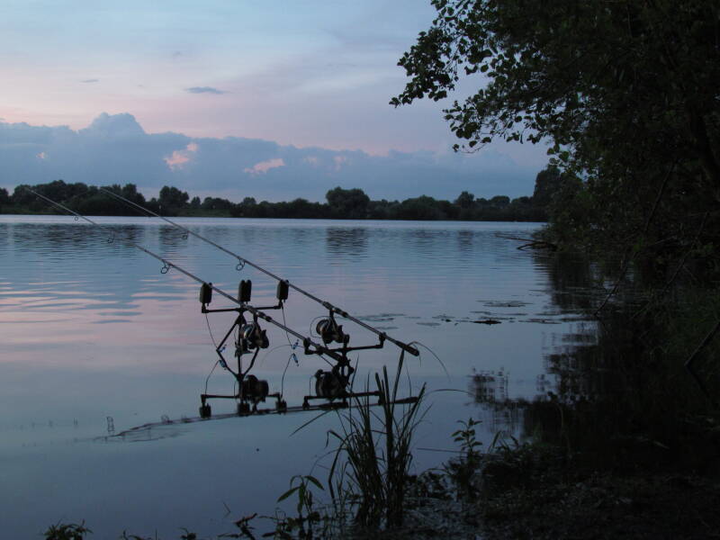 Zondag de 21e doe ik nog een nachtsessie. Ik ben al om kwart over zeven aan het water. Het is de hele dag rustig geweest aan het water. Slechts een visser heeft aan de overzijde gezeten, voor de rest was er niemand. Eigenlijk wel raar want de omstandigheden lijken beter dan tot nu toe geweest is. Een westenwind kracht vier en een temperatuur van net in de twintig graden. Ook de afgelopen dagen heb ik mijn stek aangevoerd met voorgeweekte boilies. Weinig aas verspreid over een groot oppervlak. Hopelijk zijn de karpergoden me goed gezind vannacht. Het zou mooi zijn als ik in elk geval één vis boven de twintig pond zou kunnen vangen. Om vijf voor half tien vang ik de eerste, op de zwembadstok. Met 58 cm kleinste tot nu toe. Hij is wel goed gebouwd en zal ongeveer 6,5 kilo wegen. Toch een mooi spiegeltje en ik ben er ook blij mee. Geen blank in elk geval. Een kleine vier uur later vang ik op dezelfde hengel een visje dat nog een centimeter kleiner is. Weer een spiegeltje. Tien voor drie, ook weer op de zwembadstok, de kleinste nauwelijks een halve meter. Het tiende visje in vijf nachten, hetgeen het gemiddelde op twee stuks per nacht brengt tijdens mijn vakantie. Ik mag er tegen half vijf nog eentje bijschrijven. Een spiegeltje op mijn middelste hengel en met 66 cm de grootste van vannacht. . Er volgt zelfs nog een vijfde vis om 05.40 uur. Vlak voordat de dag aanbreekt. Ik heb zelden een water meegemaakt dat je zo kon bestempelen als een nachtwater als dit. Nog weer iets groter dan zijn voorganger, ook van de middelste hengel en een pondje of zeventien. Ik waan me, qua aantallen en gewichten, even terug in Dronten. Veertien stuks al, sinds de dag dat mijn vakantie begon. Daar waar ik lag te klooien in het voorjaar, lukt het me in de zomer prima. Toch denk ik dat dit mijn laatste sessie was hier, want aantallen vangen is best leuk, maar dan moet ik tenminste ook kans maken op een vis van een iets substantiëler formaat. Dat zit er op deze put niet echt in, helaas.