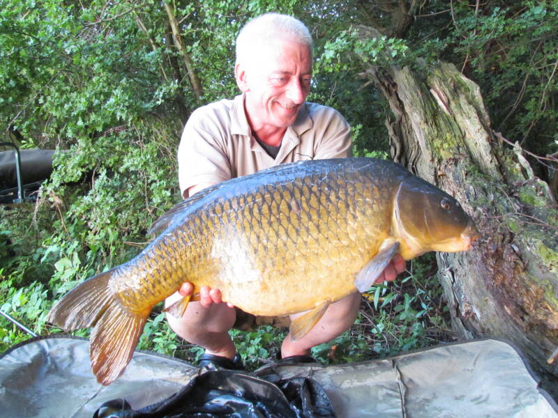 Dinsdagochtend word ik pas om kwart over zes wakker. Om zeven uur ligt alles op de kar en begint mijn moeizame tocht terug naar de dagzone. Alles is zeiknat en het pad naar de dagzone helt lichtjes waardoor mijn kar de neiging heeft om steeds naar rechts te glijden. Als ik na een kwartiertje hard zweten eindelijk bij de dagzone ben, besluit ik eerst mijn auto te gaan halen die bij Bjorn op de parkeerplaats staat. Bjorn heeft zich inmiddels al genesteld aan zijn zijde van de dagzone. Om acht uur liggen mijn hengels erin en zit ik op mijn stoeltje aan het water. Om half negen schrik ik op van een Delkim aan de overkant. Bjorn heeft er eentje. Als hij de vis op de kant heeft, hoor ik weer een beetverklikker, maar ditmaal is het er eentje van mij. We vangen allebei een klein spiegeltje, maar heel mooi beschubd. Met 7,6 kilo geen monster, maar de kop is eraf. Om 09.20 fluit het weer. Ditmaal mijn rechter stok met een crab chod. Ook deze voelt niet groot en even later zie ik een schubje draaien vlak voor de kant. Dan suist mijn leader ineens langs mijn hoofd. Ik bekijk de montage en zie dat zowel het lood als de onderste kraal verdwenen zijn. De splice heeft losgelaten. Materiaalpech, ik haat het. Maar het zijn toch drie runs in anderhalf uur en dat is hoopvol. Ook Bjorn lost nog een vis, maar lang hoeft hij er niet om te rouwen want tegen een uur vangt hij de topspiegel van het water op maar liefst 31,6 kilo.