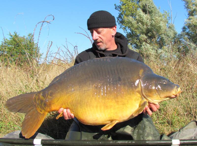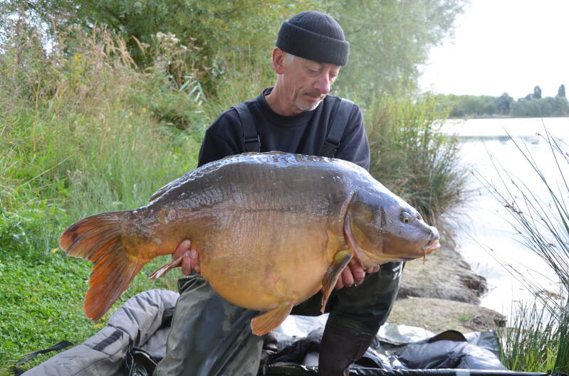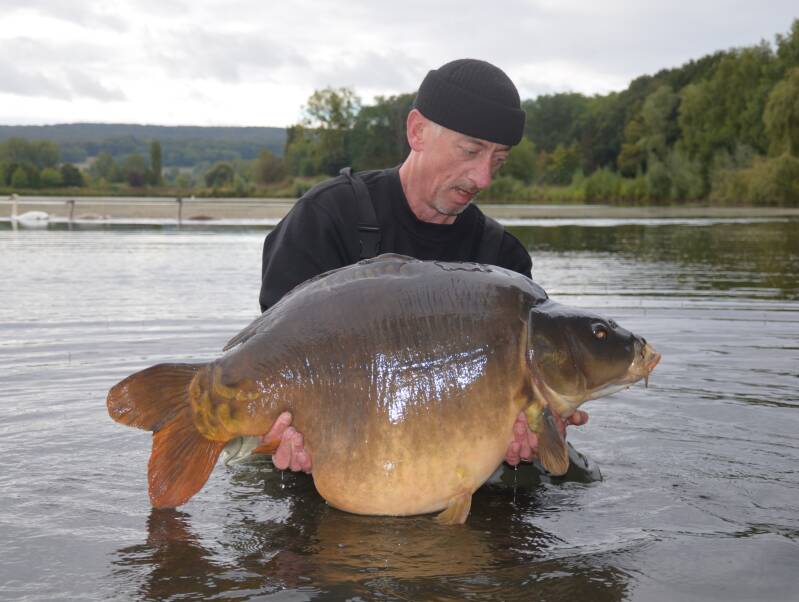 Woensdag word ik om kwart voor vijf wakker door Bjorn. Hij is al een tijdje wakker en begint met inpakken. Ook ik heb een onrustige nacht achter de rug en heb een uur wakker gelegen tussen een en twee. Om zes uur liggen er drie hengels met een chod op de dagzone. Het regent en af en toe flitst het ook verderop. Ik besluit in mijn auto te blijven zitten tot de regen ophoudt. Het heeft geen nut om alles nat te laten worden. Om vijf voor zeven is het droog genoeg om mijn vierde hengel erin te leggen. Als ik het hoekje inloop moet ik ineens vreselijk poepen. De druk loopt zo hoog op dat knijpen zelfs niet meer lijkt te gaan helpen dus de broek gaat af en ik doe mijn ding. Dan krijg ik natuurlijk een run. Klokslag zeven en de eerste run van de dag is een feit. Mijn grootste tot nu toe. Veertien kilo spiegel mag even de zak in. Voor foto's is het nog te donker en te regenachtig. Om half negen vang ik een zeelt op mijn rechter hengel. Bjorn heeft dan net een schub van 41 pond gevangen. Het gaat lekker bij hem. Hoewel ik met de actie ook zeker niet mag klagen, vallen de gewichten bij mij tot nu toe tegen. Het regent onophoudelijk en er is even wat minder activiteit op te tekenen. Om twaalf uur krijg ik weer een run op mijn rechter hengel. De regen is ruim een uur geleden gestopt en dat maakt het al een stuk aangenamer. Ik land een spiegel die net zo lang is, als hij hoog is. Weer geen monster maar schitterend getekend met een paar grote platen erop. Negentien pond kan ik optekenen bij 72 cm. Even na tweeën, pak ik nog een zeelt, nu op mijn meest linker hengel die met een zinkende boilie ligt. Ik vervang deze voor een combi-rig en gooi hem terug. De rest van de middag gebeurt er niks meer en we besluiten om vijf uur in te pakken. We rijden naar Chamouille naar het Lac de l'Aillette om te kijken of we de sessie daar gezamenlijk uit kunnen vissen. Het is niet echt opbeurend om de hele dag elk apart te vissen en alleen af en toe via de telefoon contact te hebben. De stek waar we heen willen is echter bezet en het is geen doen om nog verder weg te gaan zitten. We zijn het lopen met de kar spuugzat. We besluiten bij het ernaast gelegen Lac de Monampteuil te kijken, maar ook daar gaan we weer weg. Bjorn heeft de bokkenpruik op en voelt zich slap en leeg. Niks deugt en uiteindelijk rijden we terug naar het plasje. We eten ergens een pizza, maar hij valt volledig verkeerd bij Bjorn. Hij voelt zich ziek en gaat om half tien slapen. Tot nu toe hebben we nog niet veel samen gedaan en ik merk dat het geklaag en gesteun van Bjorn me dwarszit. Het haalt een beetje de lol uit de sessie. In mijn ogen heeft hij heel weinig te klagen met een zestiger en een veertiger op zak. Aan de andere kant is het natuurlijk ook klote voor hem dat hij zo beroerd is. Om tien uur ga ik ook slapen.