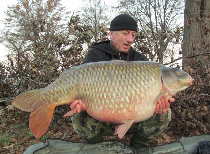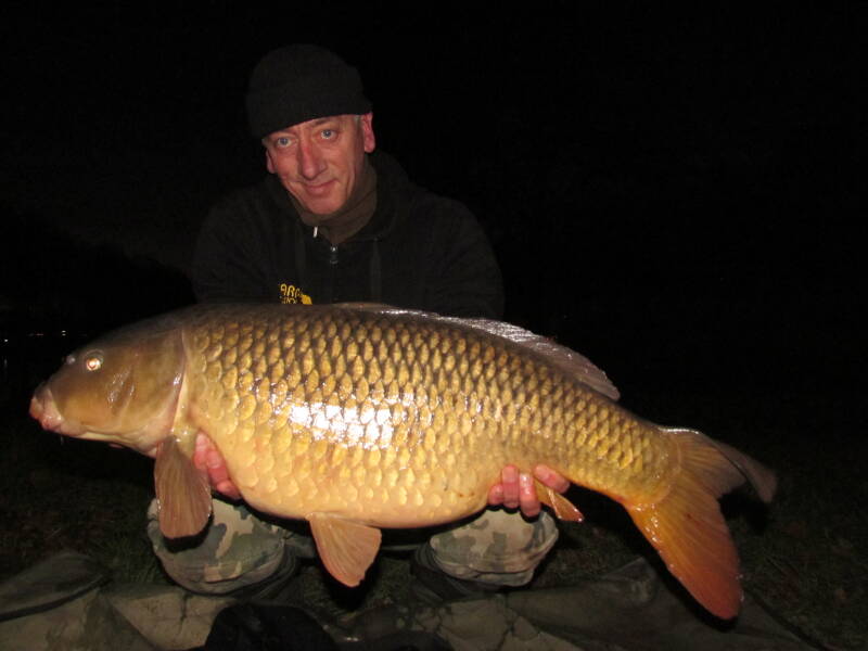 Op vrijdag de 9e december zit ik ’s middags al vroeg aan het water. Het is nog licht als mijn drie hengels op de rodpod liggen met verse KSK boilies aan de onderlijntjes. Al na een uur krijg ik een run op mijn linker hengel. Nou ja, run? De waker kruipt in etappes omhoog. Terwijl ik Bjorn aan de telefoon vertel dat het ook wel stroming of vuil in de lijn kan zijn, trekt de top toch wat krommer en besluit ik het gesprek aan de telefoon te beëindigen en mijn hengel op te pakken. Als ik contact maak voel ik wat bonken, maar de vis komt niet van zijn plek af. Als er na een minuut nog steeds niks mijn kant op komt, besluit ik zelf maar naar die kant te lopen. Ik gooi mijn landingsnet voor me uit en loop langzaam naar links. Dan begint het verdwijnpunt van de lijn toch te verplaatsen naar het midden van het kanaal en enkele minuten later kan ik het net onder een schub schuiven. Zo die is binnen. Ik weeg en meet de vis en kan tevreden zijn met dit eerste resultaat vandaag. Vijfentwintig pond en 85 centimeter worden genoteerd in het logboek. Enkele fotootjes in het donker en dan mag de vis terug. De rest van de nacht gebeurt er helaas niets meer, maar als ik ’s ochtends ga inpakken ben ik toch tevreden. In elk geval vis op de kant in de winter en dat is lekker. Ik blijf deze plaats ook nog even aanvoeren en trek mijn sessies hier nog maar een tijdje door. Een beter alternatief heb ik eigenlijk ook niet momenteel.