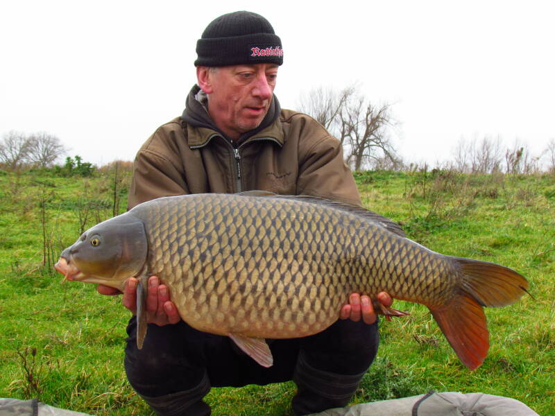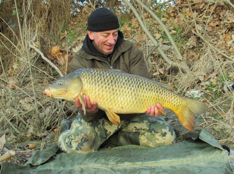 De derde sessie vis ik op donderdag 5 januari, de dag voor Driekoningen. Heel eerlijk gezegd, ruil ik alle drie die koningen met plezier in voor één enkele koningin van de Rhône, maar daarvoor zullen de karpergoden een aardige duit in het zakje moeten doen. Nu zit ik me te bedenken, terwijl mijn hengels er een half uurtje in liggen en ik net mijn eerste kop koffie achter de kiezen heb, of er iets is geweest waarin ik hen reden heb gegeven om daaraan mee te werken. Of juist niet? Ik heb vier uur vistijd om daarachter te komen. Deze derde stek is in elk geval de meest belovende. Een botenhelling waar ik zowel links als rechts van kan vissen. Links staat vier meter water onder een stel overhangende takken. Rechts lig ik op drie meter diepte en de bodem op beide stekken is keihard. Ook de omstandigheden zijn prima. Windkracht 6 en straks een zonnetje als het licht wordt. Come on you Carpgods! Om kwart over acht gooi ik beide hengels opnieuw in en een kwartier later ligt de rechtse al te stuiteren in de steunen. Happy days, en de vis aan de andere kant van de lijn voelt ook als karper. Een minuut of vijf later ligt mijn eerste vis van het jaar, een schub, opgesloten in mijn net. De haak met een snowman, zit keurig in de onderlip. Een lange riviervis van 89 centimeter en met een gewicht van 11,1 kilo. De Rhône heeft me mijn eerste riviervis van het jaar geschonken. Na de fotoshoot mag de vis terug de rivier in. Hopelijk krijgt deze vangst nog een vervolg, maar voor nu ben ik dik tevreden. Om kwart over tien, na vier uur vissen, houd ik het voor gezien. Mijn eerste doelstelling is gehaald.