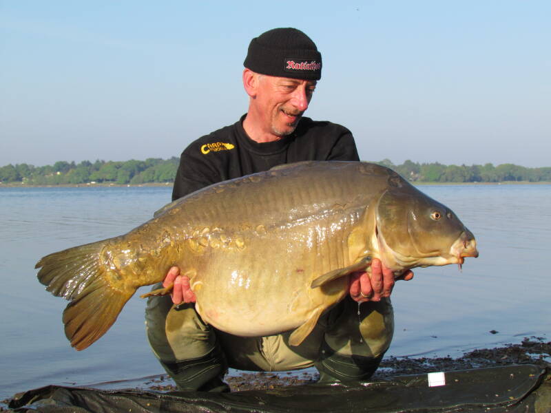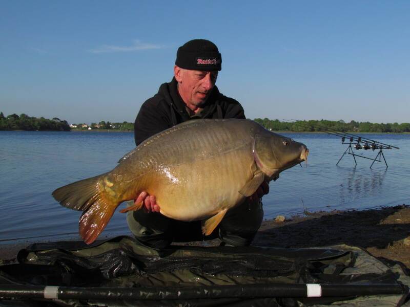 nogmaals opdraven voor een trage aanbeet en deze keer hangt er echt iets moois aan. De zwaarste vis van de sessie op 23,4 kilo en met een fraai patroon van schubben over de zijlijn. Het is ook de langste van alle vissen die ik hier vang. Ik hang de vis weg in een retainer sling en ga koffie zetten. Half zes inmiddels, dus ik vaar niet uit. Wederom aan een stiff D-rig. Deze ga ik vaker inzetten. De vissen zitten muurvast en mooi in de onderlip in het harde gedeelte. De mat zal wel stinken straks op de terugweg. Bjorn heeft vannacht een 22 kilo vis gevangen en het tellertje staat nu bij hem op negen. Als hij eerder de aanpassing had gedaan om verder uit te vissen en te zoeken naar de kleibodem, had hij wellicht nog veel meer gevangen dan nu. Om half zeven als ik bij hem sta om te informeren naar zijn laatste nacht, krijg ik een fluiter op mijn sounder box. Mijn gele led, dus de brasemhengel die ik vannacht opnieuw heb uitgevaren. Ik ren naar mijn setup. Na een kwartiertje drillen, vang ik als laatste vis nog een 18,1 kg spiegel. Het kan voor mij kennelijk niet op deze sessie. Ook negen vissen waarvan 6 dikke. We zetten deze vis na het wegen direct op de foto en dan mag hij weer terug. De twintig kilo vissen van Bjorn en mij, doen we later als het licht wat beter is. Gauw nog een bak koffie en dan door met opruimen. We fotograferen onze vissen op mijn stek, vanwege de betere lichtinval. Die van Bjorn gedraagt zich voortreffelijk, maar de mijne weet me tot wanhoop te drijven. Hij laat zich een kwartier lang niet rustig vasthouden voor de camera. Ik ben nat, bezweet en mijn kleren zitten onder het slijm en de uitgescheten tijgernoten en boiliepap. Dan mag ze terug. Het is goed geweest. De natte mat wordt in het grondzeil gewikkeld, samen met de retainer sling. Het vuilnis gaat als laatste de auto in en dan om negen uur beginnen we aan onze terugreis. Ook de terugweg verloopt vlekkeloos, hoewel er veel slechte chauffeurs op de weg zitten. Ook Parijs is een stuk drukker dan op de heenweg met motors en scooters die overal tussendoor slalommen, maar het deert me niet. Ik zit op een roze wolk en vind het momenteel allemaal prima. Tijdens een tussenstop zegt Bjorn dat hij vindt dat we weer een fijne sessie gehad hebben samen, zonder ook maar een enkele spanning tussen ons beiden. Dat vind ik ook. Ik heb een vismaat uit duizenden! Hij oppert dat het misschien ook nog wel eens een idee kan zijn om op het kleinere “PV” uit te pakken samen. Wie weet wat de toekomst brengt? In elk geval is dit een sessie die in onze herinneringen een mooi plekje gaat krijgen. Daar zijn we allebei wel van overtuigd.