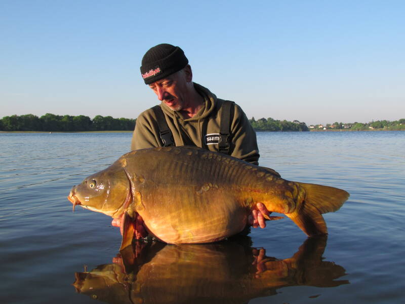 De dagen voorafgaand aan onze Frankrijksessie doe ik mijn voorbereidingen. Een van de extra “klusjes” die ik daarbij moet doen, is een ritje naar Slagharen omdat ik zo slim geweest ben om de zender van mijn voorboot te laten doorbranden. Gelukkig heeft Tonnie Schrijver nog een nieuwe voor me. Hij installeert alle functies en een uur later rijd ik, €140,00 lichter maar met een goed werkende voerboot, weer naar huis. Boodschappen worden gedaan en het aas wordt uitgezocht. Zondagochtend om tien uur ligt alles in de auto. Alleen mijn kledingtas en mijn etenswaar moet nog in de auto. Vanavond rijd ik naar ons rendez-vous punt op de parkeerplaats van “het Haasje”, de benzinepomp langs de A-2. Een rit van 800 kilometer voor de boeg, op zoek naar Franse karpers van groot water. De reis duurt lang, maar eigenlijk gaat het heel goed. Geen files, slechts op twee plaatsen "werken aan de weg", maar ook vooral nauwelijks verkeer. Zelfs Parijs is goed te doen, als je tenminste de continu wisselende snelheidsborden voor lief neemt. Bjorn is eenmaal te laat met gas terugnemen en wordt geflitst. Ik ontspring de dans. Om half zeven staan we aan het Lac. We bekijken drie stekken en ploffen uiteindelijk neer op de middelste nachtviszone die een goed uitzicht biedt over het grootste deel van het water. Ik ga uiterst links zitten op de "filmstek" en Bjorn uiterst rechts op een goede honderd meter afstand van mij vandaan. De stekken worden verkend en een groot oppervlak wordt matig en goed verspreid aangevoerd. Bij Bjorn alleen boilies. Bij mij boilies en tijgernoten. Overal ligt wel wat. De voerstrook is zeker 200 meter breed en 20 meter diep zonder een echt markant bodemverloop. Het is een langzaam aflopend biljartlaken. Een ruime open voerstek, moet de vissen laten zoeken en zwemmen. De techniek die ik gebruik is simpel. Eerst vaar ik enkele markers uit waarbij ik een gemiddeld bodemverloop zoek van 3 meter in het midden en voor de linker en rechter kant van de voerzone respectievelijk 2,7 en 3,5 meter. Daarna leg ik met de voerschep een spoor van marker naar marker. Ik voer kleine schepjes tijgers en handjes van 3-5 boilies tot tien meter links en rechts van de boot. Daarna vaar ik mijn hengels uit, haal de markers er tegelijkertijd uit en knoop vervolgens stuitjes in de lijn net achter de toppen, zodat ik met de voerboot mijn lijnen weer kan uitvaren na een aanbeet. In theorie zou dat goed moeten weren, nu de praktijk nog. Om twaalf uur liggen onze hengels erin en drinken we een welverdiend biertje. Die hakt er overigens goed in na 30 uur zonder slaap. Vijf dagen en nachten voor de boeg. Laten we hopen dat het lot ons gunstig gezind is. Ik eet wat en ga daarna een powernapje doen. Even een beetje slaap inhalen. Het is best druk aan het water met dagjesmensen, dus van een rustig dutje komt niet veel terecht. Ik kijk de hele dag uit over het water, op zoek naar springende of draaiende karper, maar er is niets te zien. Bjorn spreekt de Fransman die filmpjes op Facebook en YouTube heeft geplaatst en die weet hem te vertellen dat hij de afgelopen week zes dagen en nachten geblankt heeft op mijn stek. Dat is geen héle grote opsteker, kan ik je vertellen. Om negen uur duik ik mijn slaapzak in. Om tien over half vijf krijg ik een fluiter van jewelste op mijn linker hengel. Met knikkende knieën probeer ik de vis rustig dichterbij te krijgen. Deze mag ik niet verspelen. Een kleine tien minuten later ligt er een spiegel van gemiddeld formaat in mijn net. Wat wilde schubben over het lijf en 11,6 kilo. De kop is eraf. Hij mag even de sling in, want over enkele uren is het licht en dan mag hij op de foto. Daarna vaar ik met behulp van mijn voerbootje, de hele santekraam weer op de stek. Bjorn ziet me bezig en komt informeren naar de gebeurtenissen. Hij is blij dat ik, ondanks de slechte omstandigheden, een vis heb gevangen. Het kwik is inmiddels gestegen naar 1026 mbar en zal nog verder stijgen, vergezeld door een windkracht vier uit het noordoosten. In de ochtendschemering kijk ik uit over het water. Ik wil aanknopingspunten waarop ik kan voortborduren. Zeven uur, alarm op de tweede stok van links, mijn boeihengel. Ik loop het water in en maak contact, maar het is loos alarm. Een jagende fuut heeft mijn lijn opgepikt. Raar eigenlijk want ik kan me niet herinneren dat me dit ooit eerder gebeurd is met een fuut. Ze jagen op zicht en weten de lijnen altijd prima te ontwijken, maar deze is toe aan een brilletje. Een duikbril, denk ik. Halverwege de ochtend kijk ik nog even op de nachtviszone bij de ingang naar petit Vioreau en spreek Sam, een Engelsman die samen met zijn maat al acht dagen aan het vissen is. Ze hebben er pas twee. Ook bij hen loopt het dus moeizaam, maar volgens Sam zit er toch een goed bestand op en heeft hij hier tijdens eerdere sessies goed gevangen. Halverwege de ochtend spelen we een potje jeu de boules met een dennenappel als mikpunt en drie keien als ballen. Bjorn wint met 10-4. Tussen de middag drinken we een biertje bij mijn tent. Ik zit op mijn stoeltje en Bjorn op een emmertje met zijn "anaalknikker". Ik zal het uitleggen. Op mijn emmertje ligt een kurken balletje dat uit een van mijn pop-ups komt en Bjorn zit daar precies bovenop. Op een gegeven moment laat hij een harde scheet en roept vervolgens triomfantelijk: " Daar is'tie weer". Ja, altijd lachen met ons. Vistechnisch gebeurt er bitter weinig en we hebben hier ook geen echte mogelijkheden om wat te struinen of de vis actief te zoeken. Bjorn vindt het maar niks. Te weinig mogelijkheden en ook te weinig te zien en te doen eist zijn tol. Eigenlijk begint het bij ons beiden al wat te knagen, en we vragen ons af of we dit wel vijf dagen gaan volhouden. Dan arriveert er een Fransman van ongeveer mijn leeftijd met een grote Duitse herder, Dolf! Van veraf begint hij al te roepen: "Hey, Joe spiek Inglies?" Hij maakt een praatje en zegt dat hij paaiende karper bij de barrage heeft gezien. Bjorn bedenkt zich niet en stapt in de auto om te