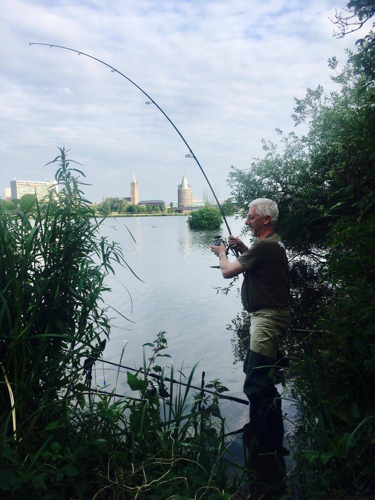 Op donderdag 6 juni ga ik onvoorbereid een nachtje vissen. Het is een hele drukke week geweest op het werk met lange dagen. Toch heb ik alle reden om met een goed gevoel terug te kijken op mijn werkweek, want we hebben mooie resultaten gehaald en op de koop toe heb ik ook een nieuwe baan. Vanaf 4 september, na mijn vakantie, begin ik als “Hoofd Calamiteitenorganisatie” in de club van Vincent Verbeet. Daarmee komt er een einde aan bijna tien jaar in het MT van Service & Operations. Een nieuw hoofdstuk in mijn toch al zo rijke loopbaan bij NS. Om acht uur liggen mijn hengels op de rodpod en even later staat ook mijn oval. Het is benauwd en warm, maar gelukkig staat er een briesje recht op de kop en dat verkoelt de zaak enigszins. Van binnen koel ik de zaak af met een ijskoud biertje en dat maakt dat ik me in een opperbeste stemming bevind. Om kwart over tien krijg ik enkele waarschuwingspiepen op mijn rechter hengel en even later krijg ik een volle run. Ik weet de vis uit de lelies te krijgen. Heel even denk ik dat de vis eraf is, maar dan blijkt dat hij naar me toe komt gezwommen. Even later ligt er een lange schub van 90 cm en 11,4 kilo op de mat. Daar zal het bij bljven deze nacht, maar dat deert me niet. Ik ben tevreden en omdat ik vind dat het al vrij vroeg warm wordt, pak ik op tijd in. Even voor tien uur kom ik thuis. Weekend!