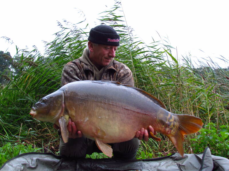 Op vrijdag 15 september vis ik een dagsessie aan de IJzeren man. Na het succes van afgelopen dinsdag, denk ik dat ik een hele goede kans maak op een super sessie. De afgelopen dagen was het erg winderig en kreeg ik met moeite mijn boilies stuk voor stuk op de stek. Meerdere tegelijk wilde niet lukken, want dan kwam ik in afstand zeker tien meter te kort. Vandaag is het wat kalmer met zuidwest twee. De barometer geeft 1011 Mbar aan en het is een graad of tien. Om tien voor zes heb ik beide hengels met de voerboot uitgevaren en ga ik aan de koffie. Net als vorige keer heb ik mijn eerste run al na 25 minuten. De vis voelt goed en neemt direct lijn, maar daarna komt hij meegezwommen. Zonder al te veel problemen kan ik de vis netten. Van bovenaf lijkt hij behoorlijk breed in het net en aan de unster blijkt dat ook. Met zijn 16,7 kilo gaat hij ruim over de dertig pond. Omdat het nog donker is, hang ik de vis even weg en vaar met mijn voerboot mijn hengel opnieuw uit. Een bakkie in de zak en ook tijd voor een bakkie in mijn mok. De dag is nu eigenlijk al geslaagd, maar er gaat vast nog meer gebeuren. De omstandigheden zijn prima. Om tien over zeven is het de andere hengel die een beet verraadt. Ik sta net te drillen als ik ook de lijn van mijn linker stok strak zie lopen. Een dubbelrun. Ik concentreer me op de eerste vis totdat ik zie dat de andere naar links gaat. Daar zijn wat obstakels dus ik verander van hengel en geef druk. Dan voel ik hem lossen. Ik pak de rechter weer op en kan na een stevig robbertje vechten vlak voor de kant ook deze het net in dirigeren. Weer een spiegel, die met twee kilo lichter dan zijn voorganger, alsnog een fraaie prijs is. Drie runs en nauwelijks anderhalf uur onderweg. Ik vaar de hengels opnieuw uit en verspreid wat voer over de hele sector met mijn voerpijp. Maar weer eens een kopje koffie en mijn vismaat bellen. Nadat we hebben bijgesproken, wil ik proberen een run te filmen. Na een minuut of twintig lukt dat ook. Als ik de stok oppak, los ik nagenoeg direct de vis. Misschien had ik hem toch eerder op peten pakken, maar in elk geval heb ik een run op de film staan. Twee gevangen, twee gelost. Niet best voor mijn gemiddelde zo. Daarna begint het weer te regenen en valt de actie volledig weg. Om half elf krijg ik weer een run op mijn rechtse hengel. Deze keer gaat alles weer goed en mag een spiegel van 14,6 even met mij op de foto. Een hoogtepuntje voor mij. Of de karper dat ook vindt, valt te betwijfelen. Hij schijt de halve mat onder en heeft zich zichtbaar tegoed gedaan aan de gratis maaltijd die hij al ruim een week voorgeschoteld heeft gekregen. Om kwart over twaalf volgt de zesde run van de dag. Het kleinste spiegeltje van de dag, maar toch nog goed voor bijna 22 pond, mag na enkele foto's retour. Het wordt tijd voor een boterhammetje en een kopje soep. Natuurlijk ben ik ook vandaag weer iets vergeten. Een lepeltje, dus een van de pootjes van mijn leesbril wordt benut om te roeren. Oneigenlijk gebruik van materiaal, maar als het werkt waarom niet? Nummer vijf komt om twintig over een terwijl ik met Bjorn aan de telefoon zit. Weer een zwakbeschubde spiegel en een gemiddelde vis voor vandaag. Exact dertien kilo. Terugvaren en terugbellen. Om twee uur vertrekt de linkse hengel eens voor de verandering. Helaas schiet de vis als hij bijna aan de kant is ineens los, terwijl ik toch niet heel hard aan het drillen was. Acht runs en drie lossers voelt niet fijn. Tien voor drie, alwéér een losser. De vis neemt direct lijn en valt er na enkele seconden vanaf. Wat is dat toch hier? Om kwart over drie vang ik onder het toeziend ook van een fietser met kind, mijn zesde vis van de dag. De kleinste, maar met een mooier beschubbingspatroon dan al zijn voorgangers. Driekwart meter en 21 pond. Tien runs en nog zo’n drie kwartier te gaan. Ook run elf volgt nog, maar dat blijkt een zeelt. Wel een grote. De karper lijkt weggetrokken. Moe maar zeer voldaan ruim ik op, voer het restant boilies en ga naar huis. Wat een lekkere sessie was dit zeg. Eens kijken of we dit een van de komende dagen of weken nog eens een vervolg kunnen geven.