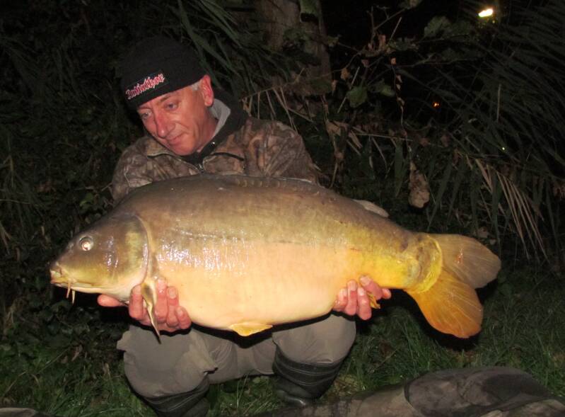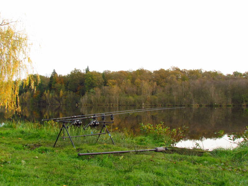Gaaf, een bak van de “knollenstek!” Na de ochtendkoffie en de foto’s draai ik om half elf mijn stokken binnen om even met Serge naar de supermarkt te gaan. Ook in Frankrijk is het vandaag “Allerheiligen” en dat is te merken ook aan de rijen bij de kassa’s. Om half één vaar ik mijn hengels weer uit naar de inmiddels bekende markante punten. De luchtdruk is gelukkig gedaald naar 1021 en gaat de komende dagen nog verder zakken. Ik denk dan ook dat de komende nachten, en hopelijk ook de dagen, wat meer actie gaan opleveren bij ons allemaal. Overigens ben ik al heel tevreden met de gang van zaken tot nu toe. Ik dineer met twee hamburgers met gebakken uien op verse stukken knapperig stokbrood en beloof mezelf wat cashewnoten als ik vanavond nog trek krijg. Even voor half acht belt Bjorn. We zitten lekker te ouwehoeren aan de telefoon als ik een run krijg op mijn linker hengel. Ik pak de stok op, maak contact en loop enkele meter naar achteren om de rek uit de lijn te halen. Ik voel de vis kopschuddend meekomen en het voelt niet slecht. Als de vis uit de gevarenzone is, doe ik wat rustiger aan. Ik heb immers tijd zat. Dan voel ik de vis nog een keer kopschudden en lost de haak, ondanks het lichte lood wat ik gebruik. De eerste losser op negen aanbeten. Jammer! Om tien voor een vang ik een spiegel, vijftig minuten later gevolgd door een tweede. Beide vissen zitten weer in de categorie “klein” en wegen respectievelijk 9,6 en 8,8 kilo. Om twee uur ligt alles weer op de exacte spots aan de overkant. Tijd voor een peuk en een beetje rust. Ondertussen is de barometer terecht gekomen in de waarden die ik graag zie. Kwart over zeven krijg ik een aanbeet op mijn linker hengel. De vis haalt me uit mijn slaap en weet van uiterst links, helemaal naar de eigen rechter kant van mijn stek te komen. Ik moet hem dus met de boot gaan halen. Een knolletje weer, maar respect voor zijn gevecht met mij. Daarna zet ik mijn “aasemmer” op de foto. Ik wil aan deze sessie de herinnering bewaren dat ik niet meer boilies heb gebruikt dan in één oud pop-up potje passen. Gesoakt in een bodempje tijgernotenwater. Volgens mij heb ik tot nu toe nog niet meer dan vijftig gram boilies gebruikt voor elf vissen en een losser. Slecht voor Hermans business. Als ik met mijn voerboot ga uitvaren, verlies ik vlak voordat ik kan droppen het vermogen. Ik sleep de boot terug en merk dat het verbindingsbusje tussen de motor en de schroefas slipt. Ik heb een heel klein imbus sleuteltje nodig om hem vast te zetten. Omdat die ontbreekt bij mijn gereedschap moet er maar eentje worden gekocht bij de supermarkt of de tegenoverliggende bouwmarkt. Om half twee draai ik mijn hengels binnen om naar de bouwmarkt te gaan die pas om twee uur open gaat. Daar koop ik voor €2,60 een setje inbussleutels waarvan de kleinste nodig is om mijn voerboot weer aan de praat te krijgen. Om drie uur vaar ik mijn eerste hengel weer uit op een plek waar zojuist een karpertje heeft gesprongen. Terwijl ik bezig ben met het vervangen van een onderlijn op hengel twee, loopt hij al af. Een schub van 81 cm en acht kilo is de klos. Dat is lekker, direct resultaat. Als ik bezig ben met mijn laatste hengel komt Rolf aangelopen met vier blikken bier, die we vervolgens soldaat maken. Hij moet morgen al naar huis omdat ze een andere keuken komen plaatsen. Dat geeft me nog meer ruimte en nog meer kans op vis. Vrijdag word ik om twee uur wakker na vijf uurtjes slaap. Niet omdat ik beet heb, maar juist omdat er nog niks gebeurd is. Tot nu toe gebeurde er namelijk elke nacht wel iets tussen elf en twee. De helft van mijn vissen heb ik in dit tijdvak gevangen. Ik lig een poosje na te denken over deze verandering en kom er niet uit. Ik hoor ook geen vis springen. Ik besluit even een tijdje wakker te blijven om te luisteren naar de geluiden in de natuur. Als ik naar buiten ga om even te plassen zie ik één verandering. Het is mistig. Zó mistig dat ik de bomenrij aan de overzijde van het water nauwelijks kan zien ondanks de volle maan die zwak zichtbaar is door de mistdeken heen. Als ik beet krijg is opnieuw uitvaren met de voerboot niet mogelijk. Ik hoor nu wel vis aan de overzijde rollen in de buurt van mijn rechter hengel, maar tot nu toe laat vis dertien op zich wachten. Tot half acht om precies te zijn. Dan loopt mijn middelste hengel af. Bij het scheppen bemerk ik een andere lijn op die achteraf van mijn rechter hengel blijkt te zijn. Ik moet dus twee stokken opnieuw uitvaren. De mist is gelukkig verdwenen dus dat is geen probleem. Om kwart over tien is Rolf klaar met inpakken. Ik wens hem een veilige reis. Gelukkig had hij vannacht nog een visje. Een oranje koi van een kilo of zes. Hans had er de afgelopen nacht twee, óók kleintjes, en Mick en Serge hadden niks. Ik mag dus zeker niet mopperen want ik vang voor het tweede jaar op rij, meer vis dan de rest bij elkaar. De laatste 24 uur zijn ingegaan en ik hoop de vijftien te kunnen halen. Nog twee vissen erbij moet haalbaar zijn. In de ochtend en middag wandel ik wat op en neer en keuvel wat met Hans terwijl ik de omgeving nog goed in me opneem. Dan ineens is laatste avond ingegaan. Ik heb vandaag mijn boot alvast opgeruimd en ook mijn auto al op de stek gezet. Een aantal dingen die ik buiten niet meer nodig heb, liggen er al in. Vanavond als het donker is, heb ik voldoende tijd om in mijn tent nog wat materiaal in te pakken. Ik wil morgen rond negen uur klaar zijn met inpakken. Dat moet lukken als ik nu al wat zaken doe. Hans en Serge hebben inmiddels ook al ingepakt. De laatste slaapt vannacht in de serre met de sounder box naast zijn stretcher en drinkt nog een biertje met Mick. Ik drink mijn laatste biertje bij de ondergaande zon die langzaam achter de bomen wegzakt. Sfeer, daar draait het om in mijn visserij én succes. Beide zijn voor mij belangrijk en beide heb ik deze sessie gekregen. Mijn batterijen zijn weer volledig opgeladen en ik ben blij om morgen weer naar huis te gaan. Naar Marianne. Na h