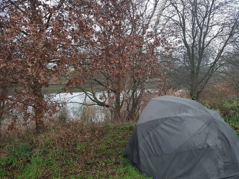 Om half zes word ik wakker. Tijd voor een ochtendplas en daarna koffie. Aan het water staan mijn hengels nog fier de kou te trotseren, zonder dat er aan ze getrokken wordt. Gelukkig heeft het niet gevroren vannacht, maar de wind is wat aangetrokken en komt wat zuur uit het noordoosten. De jongeheer wordt dus snel weer opgeborgen en even later pruttelt de fluitketel. Ik hou van het ochtendritueel aan het water als een nieuwe dag zich aandient. Helaas werkt de vis nog niet mee, dus ga ik om half tien inpakken. Er komen wel weer betere tijden. Volgende week met Bjorn naar de Maas, kijken of we een wintervis kunnen vangen.