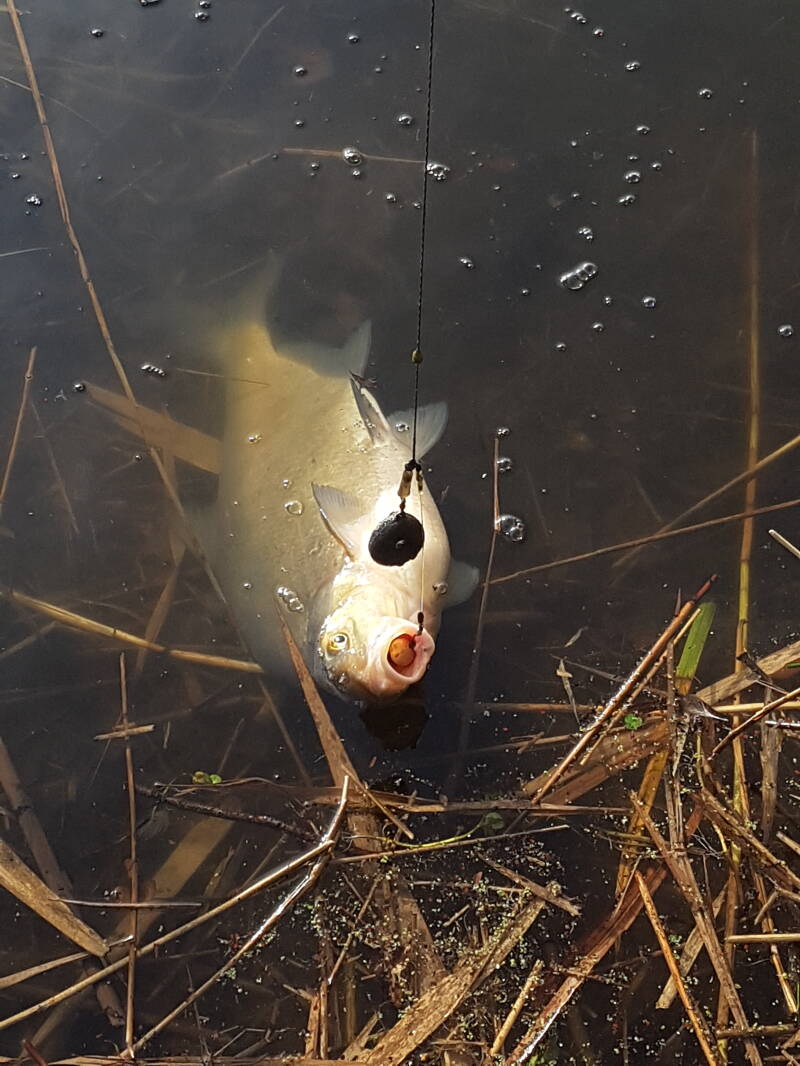 Donderdag gaan we nog eens terug. Het hele ritueel van beladen, varen en ontladen begint ons weer steeds makkelijker af te gaan. Vorige keren was ik nog wat “roestig”, maar nu gaat het ook mij een stuk beter af. Als ik in de ochtend wakker word, zie ik een sling bij Bjorns hengels in het water liggen. Mooi, hij heeft vis. We zetten een schubje voor hem op de foto en ik vang nog een winde. Daarna is het feest over en om half acht draaien we weer binnen. Ik besluit nog een paar uur bij het werfje in Weert te gaan zitten. Daar krijg ik al na twintig minuten een aanbeet op mijn hengel aan de overkant. Een buttercorn goo pop-upje heeft een karper verleid tot aanbijten. De vis zwemt eerst naar links, draait nét onder de oppervlakte waardoor ik kan zien dat het in elk geval om een goeie karper gaat en lost dan de haak. Vol ongeloof zie ik het lood en de onderlijn met een klein plopje uit het water komen. “Nee, dat meen je niet!” Ik had ‘m al bijna geteld en zag hem al voor me op de mat liggen. Ik monteer een verse onderlijn en hoop op een herkansing, maar dat zit er vandaag niet in. Half twaalf pak ik in en rijd balend naar huis. Goede vrijdag is voor mij allesbehalve dat, dit jaar.