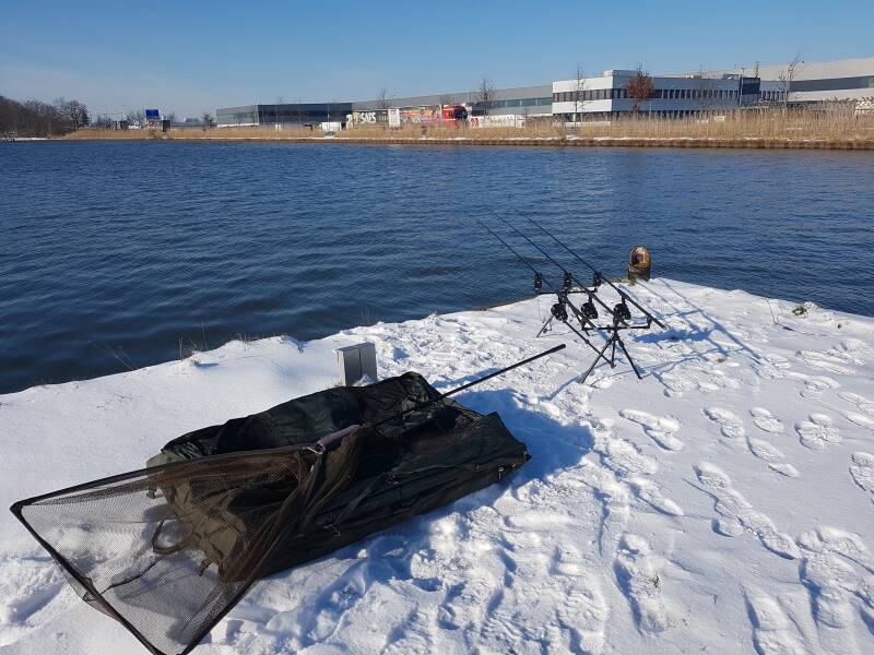 De dag erna vis ik er vier uurtjes, maar helaas wil de vis niet meewerken. De sneeuw is ook geen lang leven beschoren. In de ochtend als ik aankom is er al een deel gesmolten door de miezerige regen die er valt en om tien uur is het meeste weg. Ik kijk het nog een uurtje aan, maar dan is het genoeg geweest. Ik kijk nog even in Budel en hoor daar ook nog iets over een vijver waar inmiddels ook vissen zouden rondzwemmen van 17-18 kilo. Misschien dat ik daar eens een dagvergunning voor moet halen. Een keer proberen kan geen kwaad denk ik, maar de komende dagen ga ik eens wat sweetcorn voeren in de haven van Weert. De woonboot die er lag is inmiddels verdwenen en er ligt alleen nog een soort van ponton aangemeerd. Zowel op maandag als dinsdag voer ik er geconcentreerd een vol blik sweetcorn en enkele handjes gebroken boilies. Eens kijken of dat woensdag tijdens mijn “Outdoor Office sessie” wat oplevert. Donderdagnacht ga ik ofwel met Bjorn of in mijn uppie een nachtje doen. Eens kijken wat ik kan bedenken.
