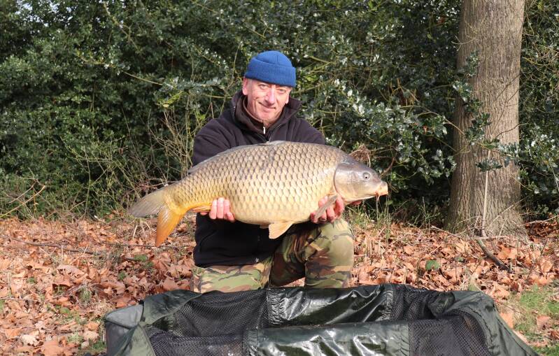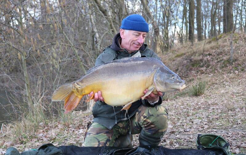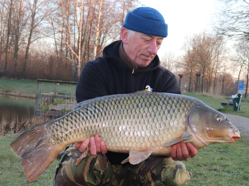Vrijdag 19 maart, ga ik kijken of mijn voercampagne enig nut heeft gehad. Als het goed is moet tenminste één van mijn hengels binnen enkele uren aflopen. Dus ook vandaag, alwéér een dagsessie. Inmiddels verfoei ik de ban op het nachtvissen, maar ik blijf tot op heden mooi binnen de lijntjes kleuren. Het weer zit eveneens niet mee. Een vieze zure noordoosten wind kracht 3, doet de temperatuur nóg frisser aanvullen dan de halve graad die mijn auto onderweg aangeeft. Helder open weer met een kouwe wind op een watertje dat behoorlijk ondiep is, lijkt op papier al snel een "No-Go" te gaan worden. Als ik de aasjes op hun plek heb gelegd en mijn oval wil opzetten, is de uitrusting op de barrow al voorzien wat een white-frosted look. Nog voordat ik mijn eerste bak koffie inschenk loopt er al een hengel af. Een schubje van 11,9 kilo mag even poseren en terug. Op de kant vecht hij harder dan in het koude water en de vis is gehuld in een dikke beschermende laag slijm. Géén parasieten, valt me op. Na deze vis heb ik ineens het idee dat er nog wel een paar vissen bij kunnen komen. Wat goed is komt snel en deze lag overduidelijk op de voerstek (van een half boterhamzakje per dag). Deze laatste toevoeging voor alle veelvoerders onder jullie. Helaas gebeurt er de rest van de dag niks meer. Je kunt dus stellen dat ik ondanks het voorvoeren weinig gevangen heb, maar je zou ook kunnen stellen dat ik dankzij het voorvoeren tóch nog vis op de kant heb gekregen bij deze slechte omstandigheden. Ik houd het maar op het laatste. Dat is beter voor mijn eigen gevoel. Volgende week samen met Bjorn een sessietje vissen. Stealth mode on en onder de radar vliegen.