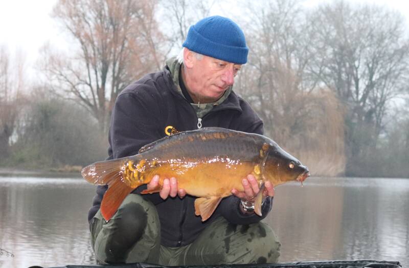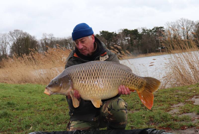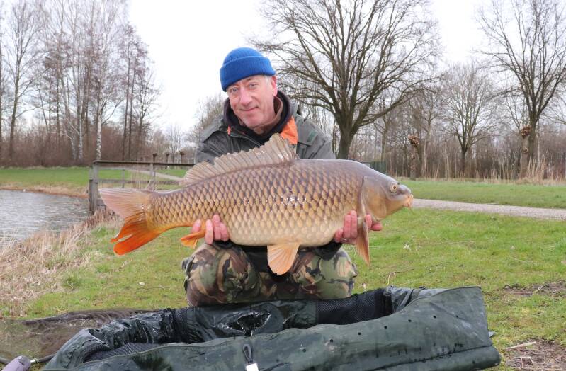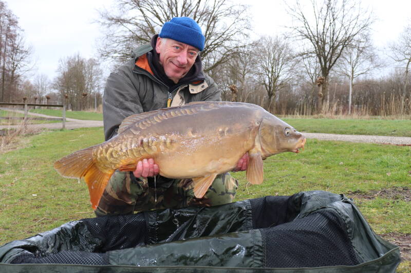 Als ik met Bjorn aan de telefoon zit, krijg ik een oploper op mijn linker hengel. Ik flikker mijn telefoon aan de kant en pak mijn hengel op. Niks daar en tegelijkertijd zie ik een meerkoet enigszins verontwaardigd boven komen. Ik deel zijn verontwaardiging en vaar de hengel opnieuw uit, een heel stuk verder naar links nu. Er gebeurt bar weinig totdat mijn rechter hengel bij de boom volgas afloopt. Na de eerste adrenalinerush, maak ik contact en scheert de vis naar links het wijd op. Even later zie ik de vis voor de eerste maal. Een schub. Na enkele uitvallen komt de vis écht aan de oppervlakte en dan merk ik voor niks blij te zijn geweest. Een graskarper. Bah bah, maar we hebben in elk geval actie gehad. Elke keer verleg ik een hengel, behalve die bij de schans want daar hangt altijd wel vis rond, weet ik uit ervaring. Om tien over half drie, ben ik net mijn linker “zoekhengel” binnen aan het draaien, als de “schanshengel” afloopt. Deze keer is het wel karper zie ik na een paar minuten. Een spiegel, niet heel lang maar wel behoorlijk breed. Even later kan ik met een zucht van verlichting de vis het net in loodsen. Happy days! De vis is inderdaad niet heel erg lang, maar weegt toch zowat dertien kilo. Na een paar foto’s mag ze terug. Ik vis nog een uurtje door en dan is het mooi geweest. Twee vissen in februari is helemaal niet slecht. Het kan de afgelopen dagen wel op zomer lijken op de kant, maar onder water is het gewoon nog winter. In elk geval ben ik dolblij met weer een mooie vis op de kant. Volgende week begint de maand maart en gaan we langzaam richting de lente. De mooiste tijd van het jaar, als je het aan mij vraagt.