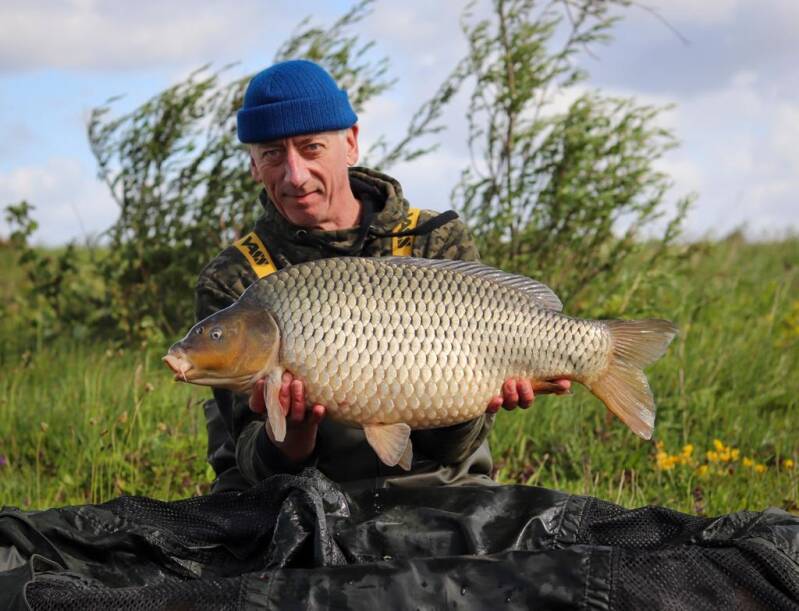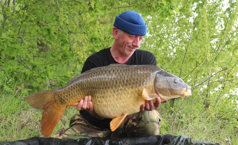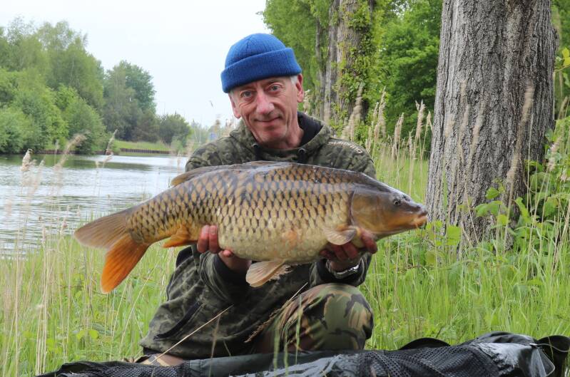 Ik heb besloten op de kop van Wessem-Nederweert aan de Maas te gaan zitten. Ik voer er twee avonden op de Slaag en op de rivier zelf. Woensdagmiddag ben ik om een uur al onderweg en om drie uur liggen mijn hengels erin. Twee op de Maas en eentje op de Slaag, waar ik overdag met drie hengels mag vissen. Binnen een half uur vang ik op deze hengel een brasem. Ik vis negentien uur op deze stek voor die ene brasem en een winde van de Maas. Het gaat hier niet gebeuren…, alweer niet! Ik heb geen idee waar ik heen moet, maar hier blijven zitten heeft geen nut. Ik heb nóg een nacht voor de boeg. Ik rijd rond en merk dat het “Duitse weekend” én Hemelvaartsdag een slechte combinatie zijn. Weinig vrije stekken en zéker op de beste stekken is het aanschuiven in het rijtje. Daar heb ik als einzelgänger niet zo heel veel zin in, dus eindig ik uiteindelijk langs het kanaal waar ik tussen twee vissers in, ook twee kilometer vrije ruimte heb. Vanavond ga ik met Bjorn mee naar het gat. Ik ga in het midden zitten en gooi twee single-hookbaits tegen de basaltkeien aan de overzijde. De linker loopt zowaar binnen het uur af en resulteert in een mooie schub die ik wat zwaarder schat, dan hij met z’n veertien kilo is. In elk geval een vis op de kant. Na de foto’s loop ik wat langs het water om mijn stappenteller en mijn conditie op peil te brengen. In de vroege avond rijd ik naar Linne. Bij de supermarkt haal ik een snelle hap die ik opeet in het haventje. Daarna blaas ik mijn boot op en vaar ik samen met Bjorn naar de plas. Achter de boompjes kunnen we prima zitten en vóór de boompjes op het emmertje, zitten we eveneens volledig uit zicht als we ’s avonds over het water kijken. Helaas gebeurt er de hele nacht niks op en winde na voor Bjorn om vijf uur en een tweede winde om een uur of half zeven. Als nog even later dezelfde hengel opnieuw een aantal piepen laat horen, zegt Bjorn alweer “winde”, maar dan loopt de hengel gewoon door. Karper! Een mooie rijen ligt even later in het net. De hengel wordt opnieuw uitgelopen, maar er gebeurt niks meer. Als Bjorn de hengel oppakt bij het opruimen, lijkt hij vast te zitten, maar dan begint er beweging te komen in zijn lijn. Opnieuw een karper, totaal onverwacht en prima gehaakt in de onderlip. Het is zelfs een lage dertiger. Mooi om hier toch nog vis te pakken zo. Aan mijn kant is niks gebeurd, maar ik heb ook niet het idee dat ik scherp genoeg gevist heb. Ik had mijn linker stok beter in het geultje kunnen vissen. Een goede les voor de volgende keer.