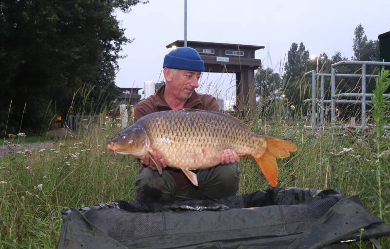 Mijn rechter hengel stuitert aan en dit is zeer zéker karper. Ik schep eerst twee keer mis, maar driemaal is scheepsrecht. Een schub van 88 centimeter en de zwaarste van vandaag met een gewicht van nét geen veertien kilo. Het is een heerlijke sessie zo met al die actie. Een “red letter day” noemen ze zoiets in Engeland en daar ben ik het deze keer helemaal mee eens. Tegen vieren, juist als ik eraan begin te denken om op te ruimen, trekt er ineens een zwaar onweer over. Ik kan nog net op tijd onder de paraplu kruipen als het volledig losgaat. Een dicht regengordijn dat overgaat in hagel wordt gelardeerd met windstoten en bliksem. De hele rataplan komt voorbij. Om half vijf wordt het gelukkig droog en pak ik als de wiedeweerga in. Het is mooi geweest vandaag. Thuis check ik ’s avonds nog even de verwachtingen voor het weekend. Misschien moet ik zondagochtend nog eens terug naar Graswinkel, want dat ging wel erg makkelijk daar. Daar zouden best nóg een of twee visjes af kunnen komen en er schijnt ook nog een goede dertiger te zwemmen. Ik sluit het niet uit dat ik daar nog een keertje terugga op korte termijn.