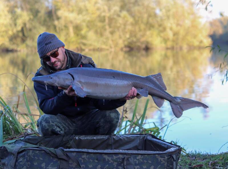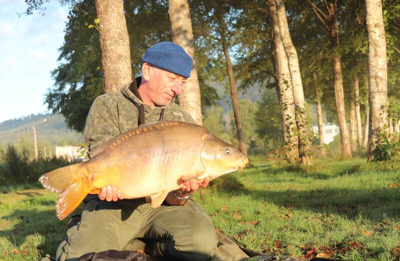 De lijnen worden opnieuw uitgevaren en hier en daar mag er nog wat voer in. Daarna gaat Bjorn even boodschappen doen en zitten we lekker in het zonnetje met een biertje. Halverwege de middag vangt Bjorn een van de zes steuren die op het water zitten. De vis komt er twee keer volledig uit en ligt even later in het door mij gehanteerde net. Een paar shots en dan mag het prehistorisch aanziend dier ook weer zwemmen. We zijn er inmiddels ook zeker van dat veel van de rare halve aanbeten bij Bjorn van een steur afkomstig zijn. Veel te vroeg valt de duisternis weer in en zijn we weer overgeleverd aan het leven in een groene champignon met kachel. We krijgen komende twee nachten nog vorst maar de laatste nacht blijft het vier graden, voorspelt de weerman. Hopelijk komt er vannacht nog een karper op de mat. Negen uur vallen mijn ogen dicht en slaap ik tot half vier. Dan word ik wakker, vol snot en ik besluit de kachel aan te steken. Hoewel ik vermoed dat ik gewoon een heftige verkoudheid heb opgelopen, besluit ik voor de zekerheid toch een Corona zelftest te doen, die zoals verwacht negatief is. Ik zet nog maar eens een bak koffie en hoor bij mijn linker hengel in het kommetje tot twee keer toe een goeie vis springen. Ik krijg zelfs een paar piepen op mijn hengel en de groene led op mijn sounder box verraadt dat het om die hengel gaat. Er zit dus vis in de buurt, maar veel kans om gevangen te worden zal hij niet meer krijgen. Vandaag arriveert er een Fransman die schuin links tegenover mij zal plaatsnemen en het recht heeft om in het kommetje zijn lijn neer te leggen. Om zes uur hoor ik er weer een vis uitkomen maar het klinkt al iets verder weg. De Fransen, het zijn er twee, komen rond de middag. De ene vist vanaf vier, de andere vanaf stek vijf. Klote, die sluiten me allebei behoorlijk af van een eventuele route. Het is nog steeds mistig en koud vandaag en ik verwacht er niet veel meer van. Beide Fransen krijgen een aanbeet en beide keren zijn het steuren. Volgens de Franse eigenaar van het water, zitten er zes steuren op de put, maar volgens mij zitten er drie keer zoveel als karpers, als je naar de vangsten kijkt. Hoewel het de vrijdag een stuk mooier en beter weer is, zal er ook in de laatste uren geen vis meer op de kant komen. Jammer, maar meer zat er niet in deze keer. Achteraf mag ik met de enige gevangen karper deze week niet eens mopperen. Dat de vis een goeie veertiger is, is een meevaller. De reis naar huis verloopt voorspoedig en op alweer een stukje omrijden na, omdat nu de A-2 op het stuk Maastricht-Stein is afgesloten, kom ik om kwart voor twee thuis. Rotzooi de garage in en Marianne helpen met haar voorbereidingen van haar quiltweek. Volgende week ga ik nog eens een keer de Maas op en kort daarna begint mijn wintervisserij weer voor de komende maanden. Wat een lastig jaar is dit tot nu toe geweest zeg.