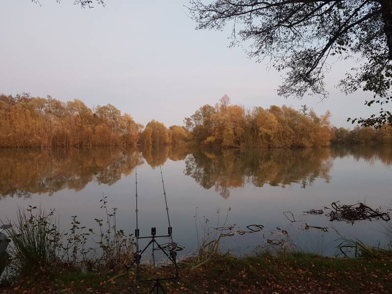 De week erna besluit ik om het Wessems weer eens een kans te geven. Ik voer enkele dagen anderhalve kilo aan gebroken bollen en wat mais en tijgernoten, die eveneens een rondreis door de blender hebben gemaakt. Ik ben op donderdag rond vijf uur op de stek en heb er een half uurtje later mijn hengels in liggen. Het begint herfst te worden en dat is aardig zichtbaar. Eikenbomen beginnen hun vruchten te laten vallen, blad van uiteenlopende vormen en kleuren ligt her en der verspreid en ook de aalscholvers beginnen al terug te komen. In het kanaal passeren enkele boten en ik hoop dat dit wat actie zal brengen. Vooralsnog niet, in elk geval. Na een poosje stopt er een auto naast me. Het blijkt een visser te zijn die hier ook gevoerd heeft. Drie kilo die naast de twee van mij de weg naar beneden gevonden heeft. We vinden het allebei niet leuk, maar erkennen ook dat dit kan gebeuren. Hij vertelt dat hij zijn voerbeurt vandaag dan maar over slaat en ik zit inmiddels ruim anderhalf uur en besluit te blijven zitten. Geen onvertogen woord naar elkaar, geen geschreeuw of gedoe. Zo kan het gelukkig ook. We zeggen elkaar gedag en ik ga mijn avondmaal koken. Er gebeurt verder de hele sessie niks en als ik ’s ochtends ga inpakken ben ik toch wel teleurgesteld. Ik had minstens een run verwacht, maar ik zal het deze week wederom zonder vis moeten stellen. Volgende week met Bjorn naar Ool. Eens kijken of we daar wél een visje kunnen vangen. Hopelijk zijn de hybrides daar niet zo actief meer, want daar heb ik mijn buik van vol. Ook hebben Bjorn en ik een betaalwater geboekt voor de tweede week van november. We willen een relaxt aantal dagen ons ding kunnen doen, zónder dat we steeds om ons heen moeten kijken naar andere vissers, boa’s of ander gespuis. Lekker een weekje relaxen in de Champagnestreek.