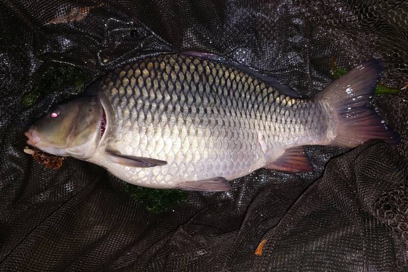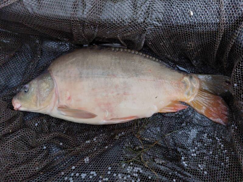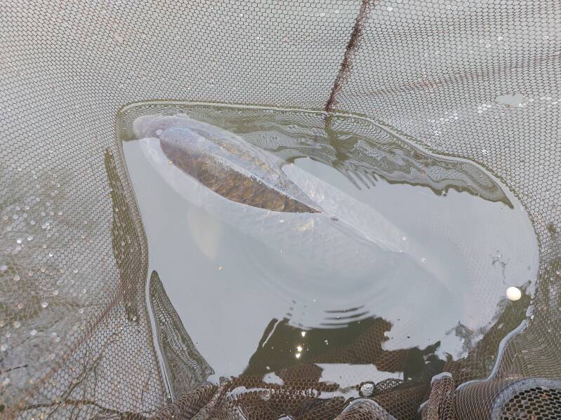 Het is gelukt, voor de éérste keer. Het jaar 2023 is exact tien uur en vijftig minuten oud, als de eerste vis van dit jaar in mijn net terechtkomt. Ik heb al sinds een dag of vier elke dag een kilo boilies in het water geworpen en de temperatuur is op deze Nieuwjaarsdag nóg warmer dan een jaar geleden. De thermometer in de auto geeft onderweg aan dat het maar liefst 14,5 graden is en dat voelt voor januari heel onnatuurlijk. Om zeven uur liggen de hengels in de plas en ik nestel me met een thermoskan koffie aan de zoom van het water. Links en rechts krijg ik wat wat losse piepen, maar het duurt dus tot tien voor elf, als ik zo’n beetje wil gaan opruimen, voordat ik de eerste binnen heb. Ik heb continu over het water zitten kijken als ik ineens vis zie draaien op het wijd. Ik gooi mijn zoekhengel met een Cream Cajouser pop-up die kant op. Voor mijn gevoel een meter of tien tekort, maar verder kan ik met deze hengels niet gooien. Het blijkt afdoende want een kleine schub gaat een half uurtje later de fout in. Ik maak een fotootje van de vis in het net en ik neem evenmin de moeite om mijn unster en meetlint voor de dag te halen. Ik zie zelfs naast de vis de pop up nog drijven.
