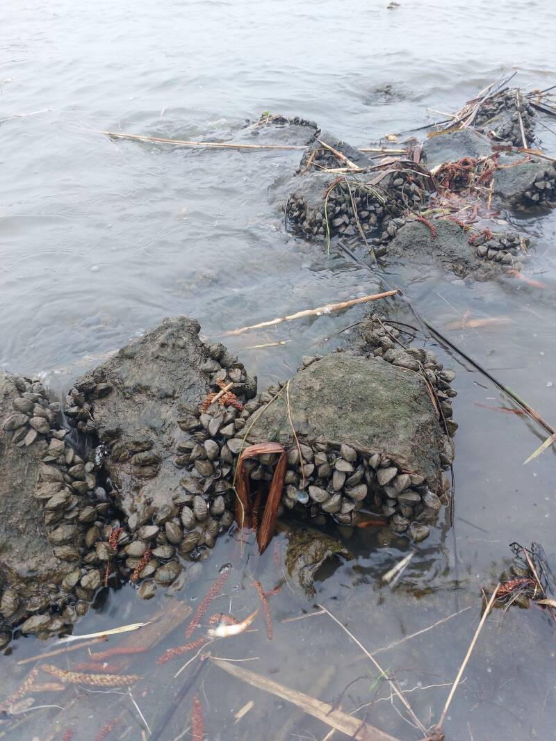 Het is donderdag 2 maart. De sessie met Frank is verder uitgesteld omdat hij alleen zaterdagnacht kan gaan en dat komt mij niet uit. Ik besluit dus terug te rijden naar mijn stek van afgelopen week. Hopelijk is die vrij en met een beetje geluk moet ik er ook wel weer een visje kunnen prikken. Ondanks het heldere weer met wat vorst in de nacht, is de barometer niet eens zo heel slecht met 1024. De wind komt uit de noordoosthoek en dat maakt dat mijn stek redelijk in de luwte ligt. Ik haal in de ochtend een half emmertje boilies uit de vriezer, waar ook wat tijgernoten tussendoor gemengd zijn, en die overgiet ik met wat kokend water. Aas moet soms een beetje worden opgestart om maximaal effectief te zijn. Eerst nog even een dagje werken. De stek is vrij dus ik kan er zitten. Beter dan ooit tevoren want het water is nog ruim 60 centimeter gezakt en ik kan mijn oval opzetten op een plek waar normaal gesproken bijna een halve meter water staat. Wel lekker want ik hoef bij een aanbeet geen halsbrekende toeren uit te halen om bij mijn hengels te komen. Vanuit mijn tent is het nauwelijks twee meter tot aan mijn hengelopstelling. Ik zit op een zandbank die volledig vlak is. Ik maak wat foto’s want dit is echt niet normaal. Hopelijk beïnvloedt het de vissen niet en krijg ik net als vorige week wat actie, maar mijn vismaat is daar niet zeker van. Met enige branie vertel ik hem dat de verrassing die hij vorige week aankondigde er deze week uit gaat komen. Een bijkomend voordeel van deze lage waterstand is dat de vissen nu niet onder de steiger kunnen duiken en dat ik, als het tóch nodig is, de steiger op kan stappen zonder natte voeten te krijgen. Ondanks het zonnetje voelt het maar ‘dun’. Tegen zessen doe ik de kachel aan want de wind maakt het best fris. Ik kijk na het eten een filmpje en doe om half elf de kachel en het licht uit. Ik word gewekt door een aanbeet maar heb geen idee hoe laat het is. Het is de linker hengel. Tijdens de dril verruil ik mijn Crocks voor mijn laarzen zodat ik het water in kan lopen en trek even later een lange vis het net in. Lang is hij zeker, 92 centimeter, terwijl hij toch maar veertien kilo laat optekenen. Ik maak een paar nachtfoto’s en dan mag de vis weer terug. Als ik op mijn horloge kijk en terugreken, moet de beet rond 01.15 gekomen zijn. Dat geeft me ruim voldoende tijd om tijdens deze sessie nog wat bij te kunnen vangen. De haak is nog scherp, dus de hengel gaat terug met een paar schepjes voer erbij. Daarna kan ik even opwarmen bij de kachel die ik weer heb aangestoken. De vis voelde aan als ijs en dat merk ik aan mijn vingers als ik mijn verslag bijwerk. In elk geval geen blank en alweer instant vis van deze stek. In de ochtend stuurt Rolf een berichtje dat hij even langskomt. Leuk want we spreken elkaar te weinig. Helaas krijg ik een uurtje later een foto. Hij heeft een klapband en gaat het niet halen. Ik maak nog enkele foto’s van zoetwatermosselen die normaal gesproken onder water aan alle keien gekleefd zitten en van enkele obstakeltjes waar de lijn achter kan blijven haken bij een normale waterstand. Altijd goed om te weten hoe de zaak er onder water uit ziet. De vangst krijgt deze week helaas geen vervolg, dus is het inpakken en wegwezen geblazen. Ik heb nu al zin in de volgende sessie.