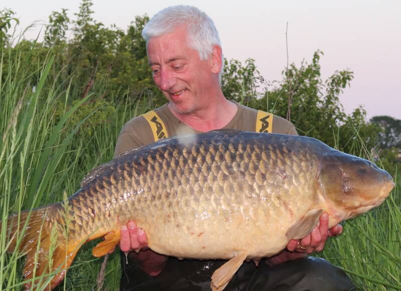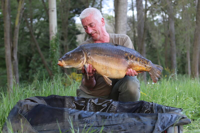 Tien over negen volgt er een goeie schub van 33 pond, maar de vis die zich een kwartier later meldt, spant de kroon. Met één meter twee, een lengte om U tegen te zeggen en het gewicht van 24,7 kilo mag er ook wezen. Vooral de enorme kop die boven water komt bij het scheppen, maakt indruk. Daarna moeten de stokken eruit, want het is tijd en ik wil niet de kans lopen om hier weggestuurd te worden. De hengels en piepers verdwijnen achter in de auto en ik kruip mijn tent in. Ik heb rust nodig want dit was anderhalf uur keihard werken. Na een nachtje slapen ben ik er om vijf uur uit. Er wordt een nieuwe emmer voer gemixt en uitgevaren langs de lelies. Daarna mogen de hengels uit de auto. Ze worden voorzien van verse haakaasjes en op hun plek gelegd. Lang hoef ik niet te wachten, want beide pop-up hengels leveren binnen het eerste half uur beiden een kroeskarper op. Als het te gek wordt met dat gespuis ga ik met twee hengels vissen want dubbele runs zijn hier zeker niet uitgesloten en dat is je eentje best een opgave. Ik bedenk me ook dat de dikke vis die ik gisteren ving een twentyfour-seven vis was. Mooie woordspeling vind ik zelf. Half zeven zit ik aan mijn tweede kop koffie van de dag en kijk over het water. Genieten met een grote G! Het regent behoorlijk en ook wat naar binnen. Ik zit al even na te denken over een luifel, als ik ineens “bonjour” hoor. Het is een Garde de Peche die mijn papieren controleert en me erop wijst dat nachtvissen hier verboden is. Ook is hier het maximale aantal hengels vastgesteld op drie. “Pas de problème”, geef ik hem als antwoord en loop naar een van de hengels om hem binnen te draaien. Ik ben allang blij dat ik hier gedurende de nachtelijke uren mag verblijven. Als ik hem vraag of het oké is om een luifel aan de boom vast te binden, Fransen zijn soms nogal van de regels op momenten dat je dat niet verwacht, is dat ook helemaal in orde. Zolang ik de boom maar geen schade toebreng.