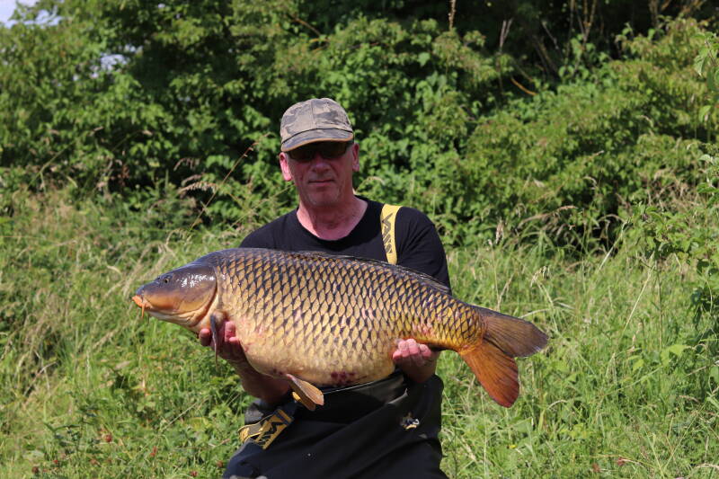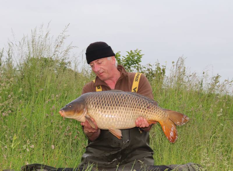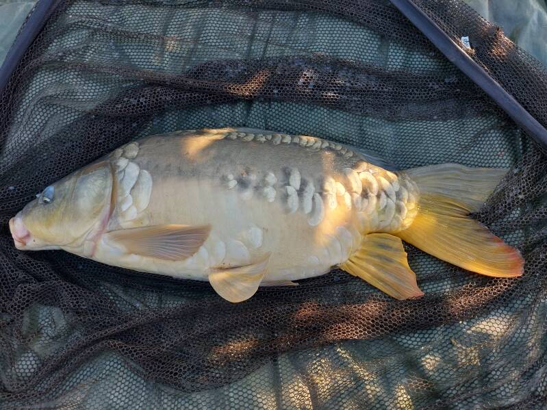 Elke dag rijd ik even op en neer naar de plas om te voeren. Ik heb de hoeveelheid voer aangepast naar 700 gram omdat de vis niet echt gretig was ondanks de hoge temperaturen en goede omstandigheden. Donderdag vertrek ik thuis om een uur of vier. Ik moet eerst nog langs de supermarkt voor een maaltijd, maar om kwart voor vijf liggen de hengels op de steunen. Het duurt ongeveer een half uur voordat de eerste vis zich meldt. Een schub die een kilo zwaarder is dan de debuutvis van vier dagen geleden. Daarna komen er voor het slapen nóg drie vissen op de kant, waaronder de eerste grotere van vijfentwintig pond. Na half elf blijft het rustig tot half negen de volgende ochtend. Dat vind ik niet erg want een goede nachtrust is ook fijn. De eerste in de ochtend is een spiegeltje. Een soort van ‘dubbele rijen’, maar jammer genoeg met een frommelbekkie. Vervolgens vang ik voor en tijdens het inpakken nog twee schubs waarvan de laatste ruim 22 pond laat aantekenen. Ook die mag nog even op de foto en dan is het mooi geweest voor deze sessie. Kennelijk heeft de aanpassing van de hoeveelheid voer geholpen, want het liep met zeven vissen een stuk beter dan op zondag. Volgende week zal ik eerst maar eens kijken wat het weer gaat doen en daarna pas een besluit nemen waar ik heen ga. Hoe raar dat misschien ook klinkt, want ondanks de aantallen verveelt dit snel en is het een beetje té makkelijk. Het voelt zeker niet als een prestatie om op deze pretvijver dit soort aantallen te vangen. Dan is een enkele vis van de Maas of het kanaal een stuk meer waard in deze tijd van het jaar. Anderzijds is het wél lekker dat de teller al op 8 staat dit seizoen. Een goed begin is immers het halve werk.
