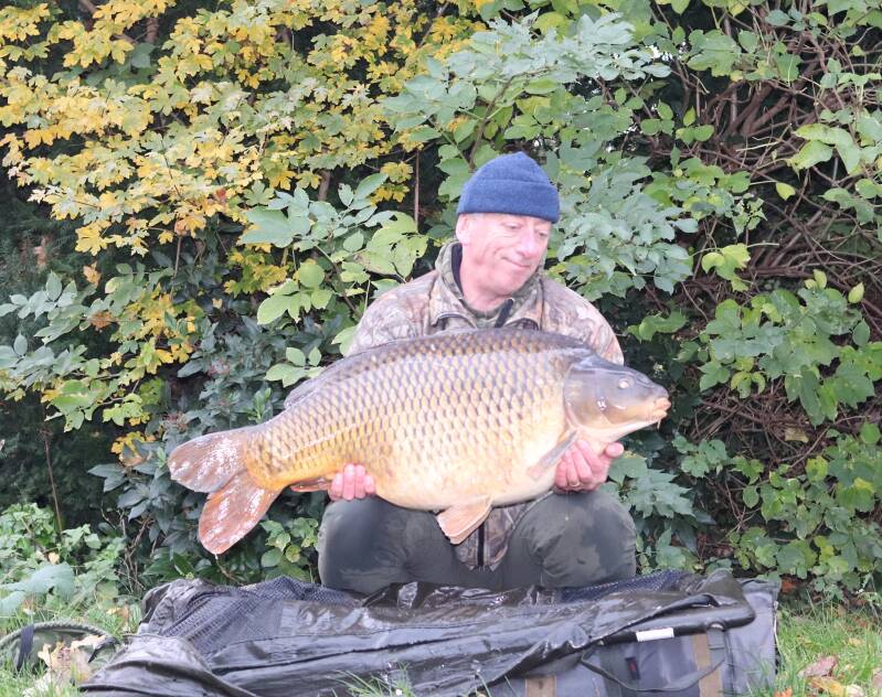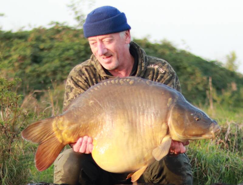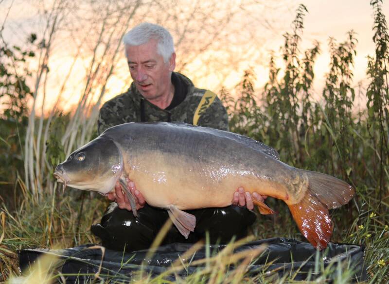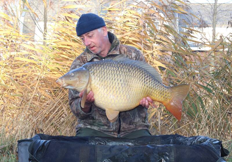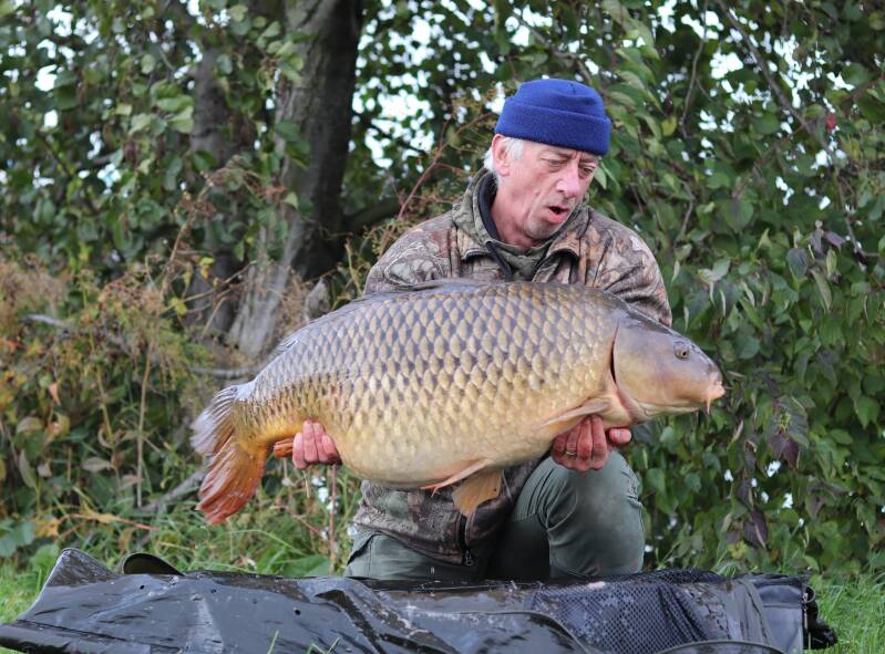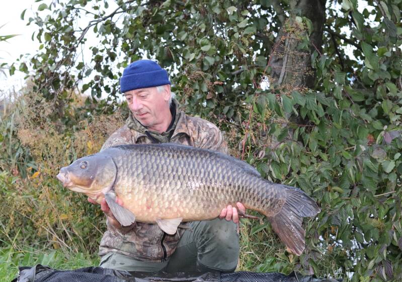 De vis komt mee en blijft weer dicht in de kant. Zo vechten al die krengen. Als de voorslagknoop door het topoogje gaat zwenkt “het kreng” naar open water en dan voelt het ineens héél anders. Ik moet twee keer schudden met het schepnet voordat de vis erin zit en als ik hem uit het water wil tillen voel ik al dat dit een beste veertiger is. En héél goed ook, zo blijkt. De vis weegt exact 24 kg en is maar twee centimeter kleiner dan zijn voorganger. Leuk detail is dat deze vissen omgekeerd evenredig aan elkaar zijn. De eerste is een metervis van nét geen veertig, deze laatste is een veertiger van nét geen meter. Volgevreten voor de naderende winter ligt ze op de mat en poept de gele smurrie uit van mijn Scopex boilies. Wat als een slechte sessie begon, is inmiddels een “red letter day” in mijn logboek. Mijn vorige Maas PB, een spiegel van 47 pond, kwam van deze stek en dit nieuwe PB dus ook. Het is de hele dag druk met boten. Ik heb vooral last van de roofvisboten (en bellyboats) die af en aan langskomen. Van de pleziervaart heb ik op hun vervelende golfslag na geen last. In al deze drukte is het geen wonder dat er geen vis langs komt om eens rustig te azen. In de schemer leg ik mijn hengels opnieuw weg met vers aas. In de kwalificatie wordt Max derde na beide Ferrari ’s. Dan ga ik slapen. Om vijf over twee krijg ik een aanbeet op mijn middelste hengel. Eigenlijk is het al vijf over drie, maar omdat de wintertijd is ingegaan is de klok teruggezet en is het dus weer een uurtje vroeger. Een echte vis in een soort van fictieve tijd dus, want de natuur merkt niks van het verzetten van onze klok. Enfin, de karper aan het einde van mijn lijn blijkt een schub van veertien kilo. Ik maak gauw een foto op de mat en dan kan hij snel terug in het water. Het miezert en ik heb weinig zin in gehannes met mijn zelfontspanner. Daarna lig ik wat te klunzen met mijn sounderbox. De batterij is leeg en moet vervangen worden. Ik haal er een uit een van mijn Delkims, want ik heb geen reserve bij me. Kortom het is ruim een uur later voordat het gedoe allemaal weer achter de rug is. Het is overigens ook een stuk harder gaan waaien. De wind staat met kracht vijf uit het zuidwesten en laat de tent kraken. Je zou zeggen dat de vis toch actief zou moeten worden met dit weer. Om vijf uur is het de rechtse hengel die me een aanbeet oplevert. Een spiegel met een frommelbekje die een mooie 16,2 aantekent en met zijn lengte van 90 cm is ook niks mis. Het is alleszins geen knappe vis want naast de lelijke wonden aan zijn bek lijkt hij op zijn lijf nog meer littekens te hebben en zijn rugvin is ook niet helemaal gaaf. Een karaktervis, zouden ze dit in Engeland noemen. Omdat het zo licht wordt, hang ik de vis weg en fotografeer ik hem later. Ik slaap tot half acht en word wakker in een winderige wereld. De stroming staat het gat in en maakt dat ik twee hengels opnieuw moet ingooien. De vis in zijn retainer ligt er goed bij en kan over een half uurtje op de foto. Er wordt me kennelijk iets gegund daarboven want iets na acht uur loopt mijn middelste hengel, een van de twee die ik opnieuw had ingegooid, volgas af. Een schubje net onder de elf kilo kan mooi even poseren omdat ik mijn spulletjes net had klaargezet voor de fotoshoot van de spiegel in de zak. Beide vissen staan er prima op vind ik en zwemmen even later weer hun rondjes in de Maas. Heerlijk om de dag zo te beginnen. Omdat het weer nu goed is om droog op te ruimen begin ik daar vast mee. Ik haal om tien uur mijn hengels eruit en vang de overtocht aan. Het is mooi geweest. Fijn dat deze sessie zo’n goed verloop heeft gekend en ik vraag me af of de volle maan periode hier mogelijk een rol in heeft gespeeld. Wat in elk geval wederom bevestigd wordt, is dat bij een dalende watertemperatuur in het najaar, de vissen inactief zijn in de periodes met regen. Volgende week nieuwe avonturen.