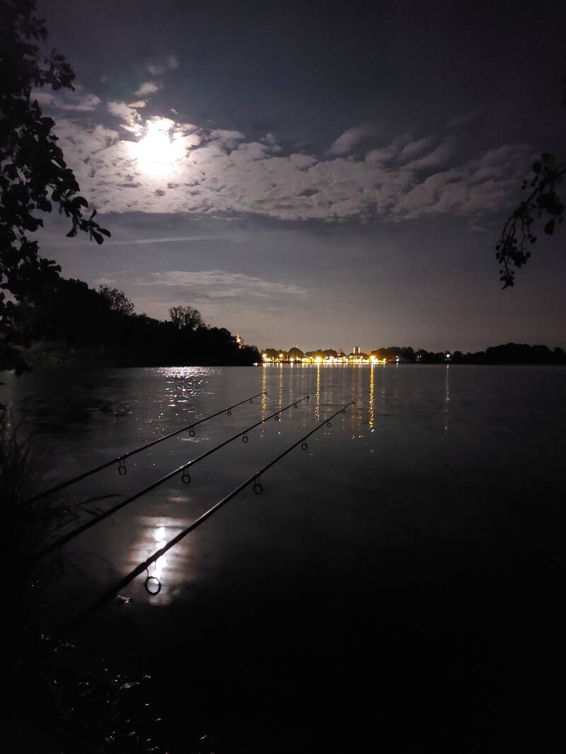 Zaterdag ben ik al om twee uur weg. Ik heb in de ochtend de voortuin herfstklaar gemaakt en vind dat ik genoeg gedaan heb. Alle taxus en buxus gesnoeid en dat was een beste klus. Aan het water is het óók nog een hele klus om al mijn materiaal bij het water te krijgen. Twee keer met de kar van auto naar water, boot oppompen, auto wegzetten en op naar de stek. Daar aangekomen gooi ik eerst de hele santenkraam op de oever en staak dan weer van wal om de stek te verkennen. Ik ben vooral benieuwd waar het wier staat. Om zes uur liggen er drie hengels in. Alle drie uitgevaren met de boot en redelijk compact eromheen gevoerd. Het is een mooie stek, zowel bij dag als bij nacht. Helaas sluit ik de sessie zonder vis af. Op de terugweg heb ik nog even contact met Rolf. Ik maak me nog geen zorgen en wil het plan gewoon uitvoeren, maar voor de zekerheid bel ik ook nog even met Bjorn. Die bevestigt dat ik me niet te druk moet maken en herhaalt dat het allemaal wel goed zal komen als we ons plan uitvoeren. Daar ga ik dan maar vanuit en hoop dat Rolf, die dinsdag een nachtje gaat doen en vervolgens gaat voeren, meer succes heeft. Ook al is de huidige hengelopstelling niet heel slecht bevallen, lijkt het me toch beter om de komende sessie met mijn rodpod te vissen. Dat geeft me nét wat meer ruimte.