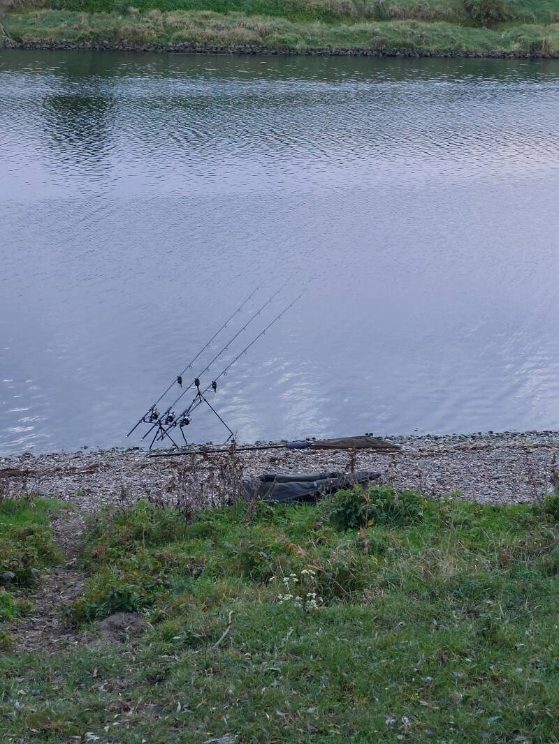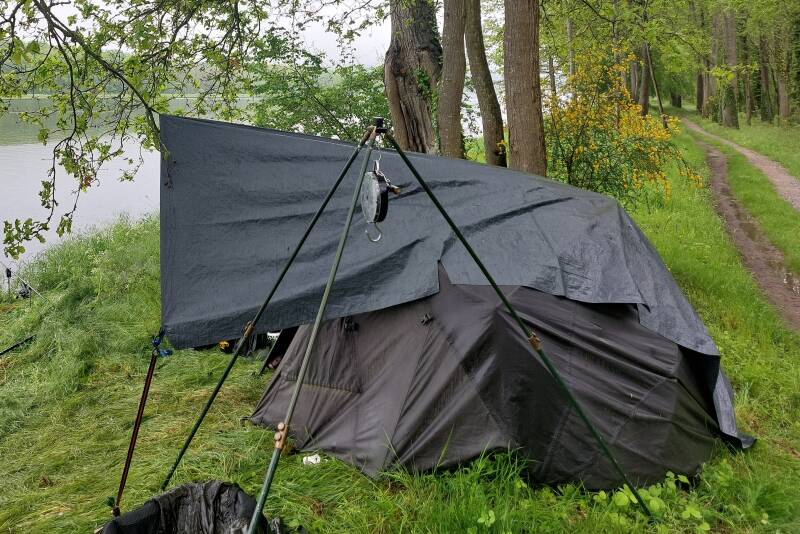 Een week later zit ik bij het werfje in Weert. Ik heb pas laat besloten om te gaan, want de voorspellingen zien er niet goed uit. Aan een stuk door regen. Pas op donderdagochtend lijkt het allemaal wat genuanceerder en besluit ik tóch te gaan. Ik zit iets verder naar rechts dan gebruikelijk. De grond is daar wat vlakker en minder drassig. Om vier uur liggen de hengels erin. Ik heb droog kunnen opzetten en pas na het warme eten is er wat regen van betekenis voorspeld. Dat klopt want het regent van zeven tot twee en daarna blijft het droog. Het valt mee met de nattigheid, maar tegen met de vangsten want er gebeurt niks. Volgende week weer naar de Maas.