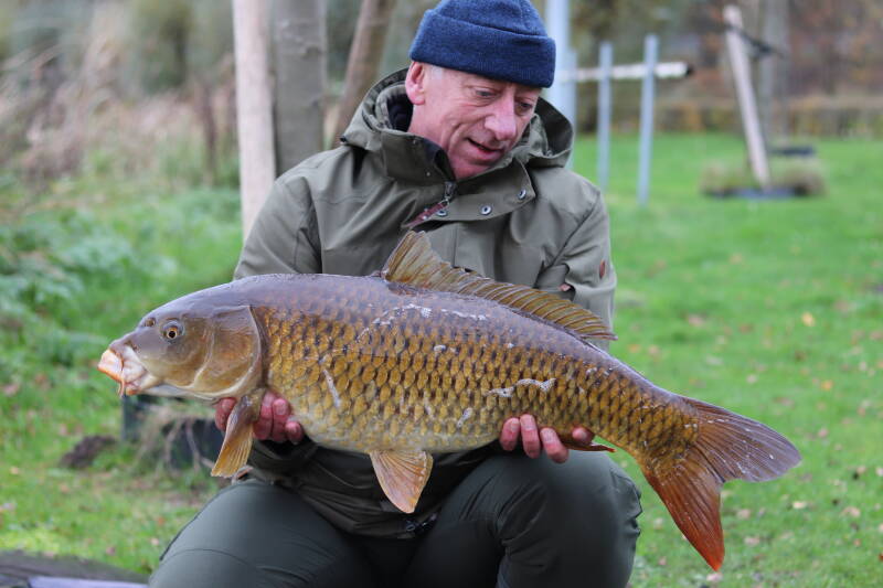 De stek die Bjorn me nog als tip gaf is onbevisbaar. Nou ja, ik zou er wel kunnen vissen, maar door de hoge oevers is een vis scheppen van een compleet andere orde. Ik zoek het voor de derde stek dus maar aan de Noorderlaanvijver, waar ik al een hele poos niet meer geweest ben. De laatste keer was een wintersessie met maden, ruim tweeënhalf jaar geleden. Kwart over één liggen de hengels erin en ik ga het hier minimaal twee uur de kans geven. Tegen drie uur begin ik te denken om te gaan opruimen, maar dat is te voorbarig want nauwelijks 10 seconden later krijg ik een run op mijn rechter hengel. Ik sprint de auto uit en weet even later een schubje schaakmat te zetten. Een karpervisser die ik ken van de karpercommissie komt net aanlopen en speelt voor fotograaf. De vis mag terug en ik ga direct daarna ook maar inpakken. Acht uurtjes vissen op drie verschillende stekken heeft me in elk geval een vis opgeleverd en daar mag ik op een dag als vandaag gewoon tevreden meer zijn. Op de weg terug stop ik bij de supermarkt voor winterwortels, rookworst en aardappelen. Vanavond eten we wortelstamp. Daar is het ook echt weer voor na een hele dag in de buitenlucht. Volgende week maar weer ergens een nachtje doen.