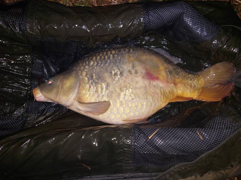De dinsdag ga ik mee voeren. Mijn auto is klaar en ik kan op tijd bij Bjorn zijn. We voeren een mix van tijgernoten, maïs en boilies en slaan de woensdag het voeren over. Het belooft donderdag vies weer te worden, maar we gaan tóch want we gaan veel actie krijgen is de verwachting. We worden niet teleurgesteld! Als donderdag de hengels om kwart voor acht op de steunen liggen is het mijn diepe hengel die na een kwartiertje al afloopt. Terwijl ik sta te drillen krijgt ook Bjorn een aanbeet en zo liggen de eerste vissen al snel op de kant. Het wordt in elk geval geen blank. Voordat we gaan slapen staat de teller al op vijf. De hoofdprijs is een graskarper van 28 kilo en één meter twaalf bij Bjorn. In de nacht vangen we er allebei nog eentje bij en vanaf vijf uur ’s ochtends is het spitsuur. We krijgen tussen 5 en half negen nog maar liefst negen karpers op de kant. De grootste is ook hier weer voor Bjorn. Een schub van 105 cm en 18,6 kilo. De linkerkant is toch echt de kant waar de zwaardere vissen vandaan komen nu. Ik moet het doen met een 13,2 spiegel als meest memorabele vangst. We eindigen allebei met het enorme aantal van 8 stuks. Van de twintig runs die we gekregen hebben los ik er één en Bjorn drie. Wat me opvalt is het aantal schubs dat eruit komt. Ik had er zes op slechts twee spiegels en bij Bjorn is dat vergelijkbaar. Het is overigens wel grappig om te zien dat ik al mijn vissen ook aan mijn eigen hengels gevangen heb. De run die ik loste was op een hengel van Bjorn. Dan was er nog de run waarbij ik direct vanaf het begin lijn van mijn spoel af voel lopen terwijl een krachtige vis van me afzwemt. Het blijkt een meerval. Niet dat ik hem te zien krijg, maar de winde aan mijn onderlijn die ik uiteindelijk op de kant trek, zit vol bijtwonden en het beestje is half dood. Hij voelt ook ruw aan en daar kan maar één verklaring voor zijn. Een meerval heeft hem gepakt en dat heeft de run veroorzaakt. Na al het geploeter en harde werken is de pijp om half negen weer helemaal leeg. Er is nauwelijks tijd om de vissen op de foto te zetten en ik ben blij als alles weer in de auto ligt want dit zijn slopende sessies. Naar huis, opruimen en 8 vissen noteren in het logboek met een klein gouden randje eromheen.